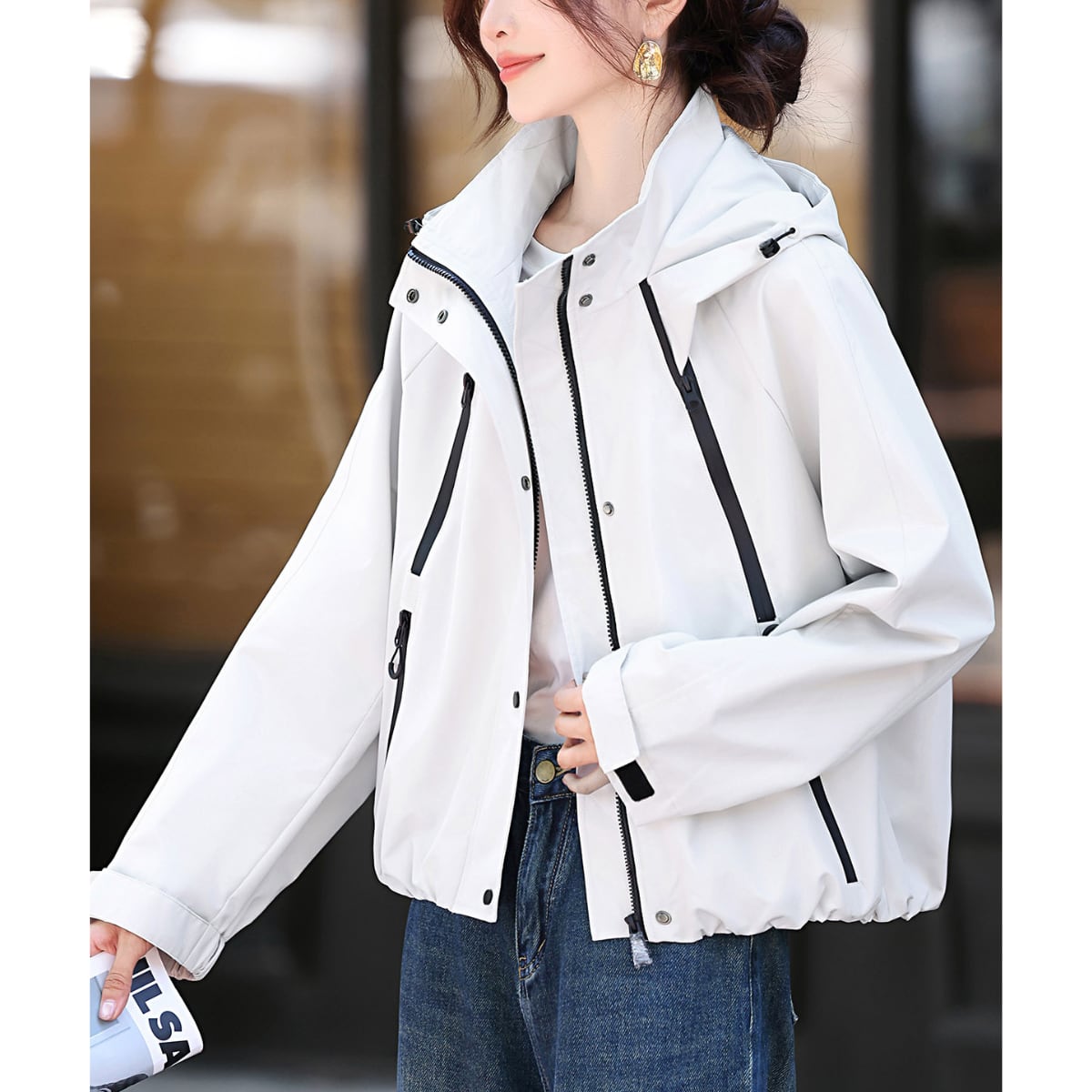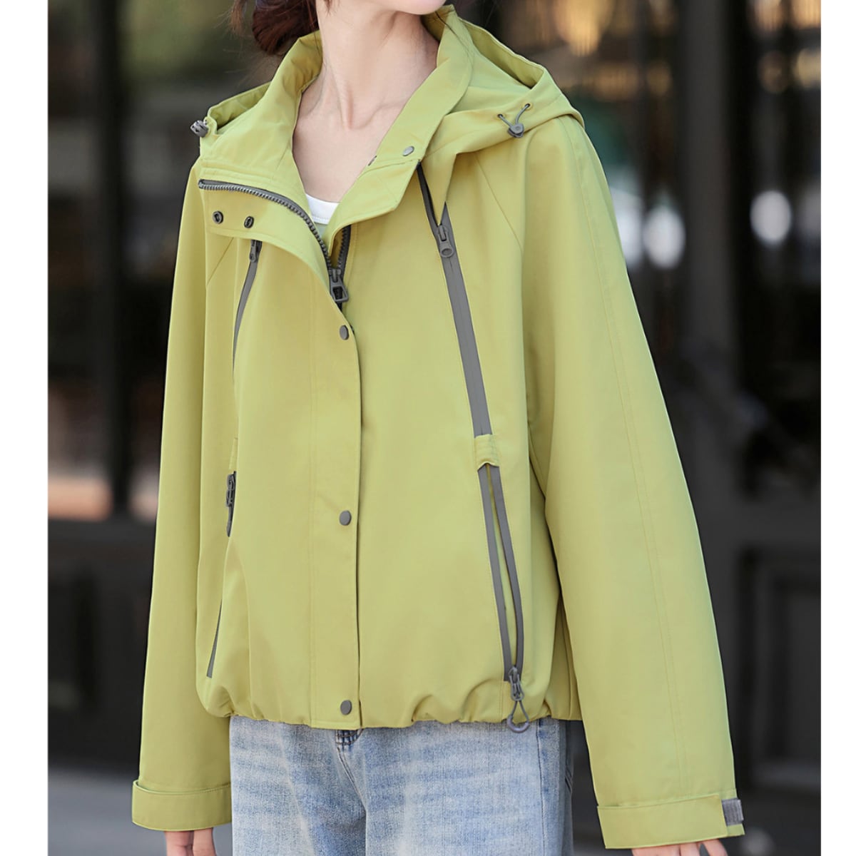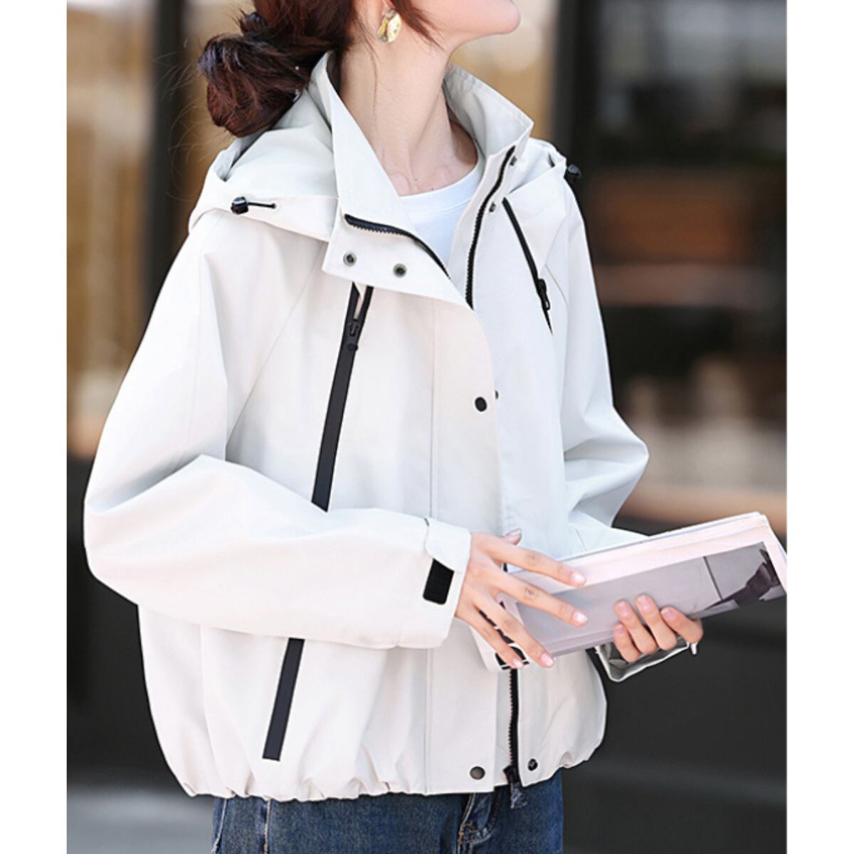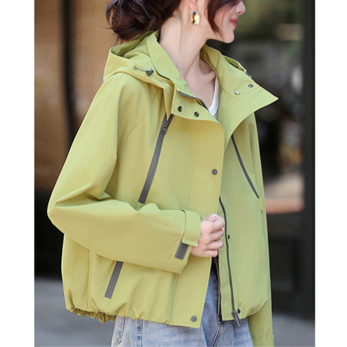 腰丈のコンパクトなシルエットで、スタイルアップ効果も期待できます。フード付きなので、急な小雨や肌寒い日にさっと羽織れるのが魅力です。