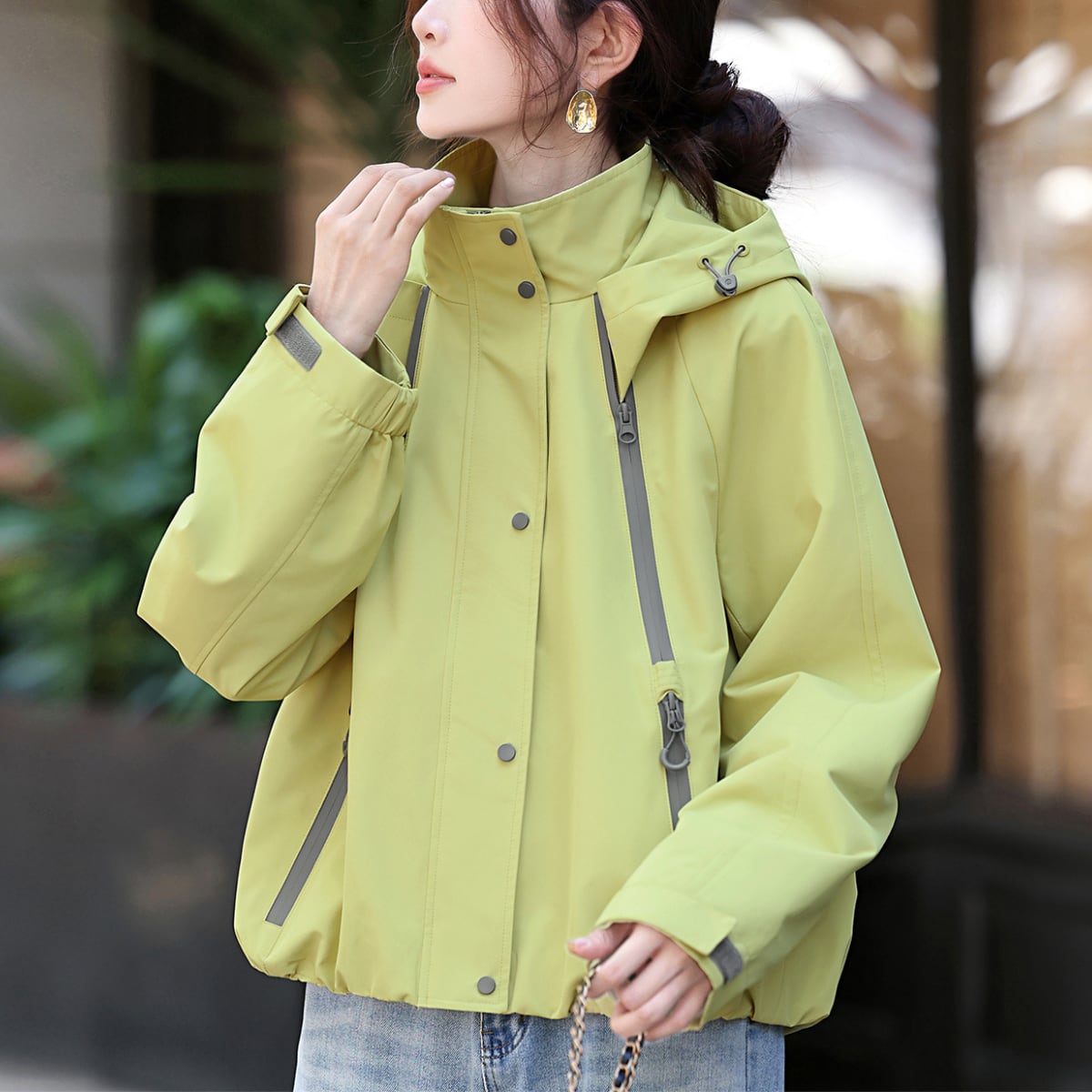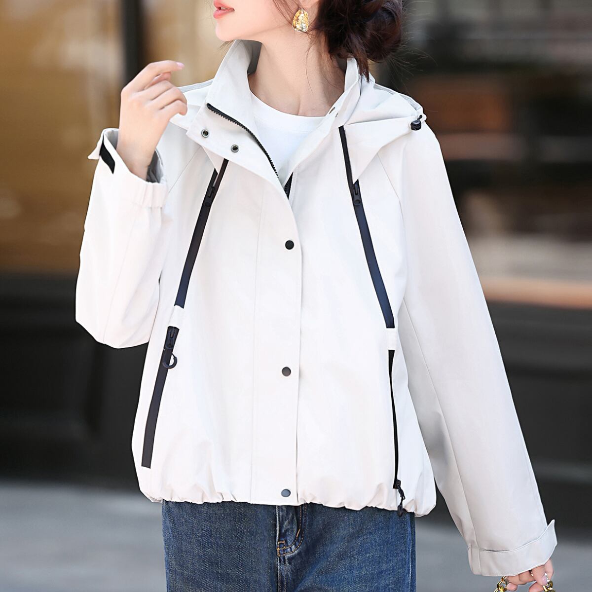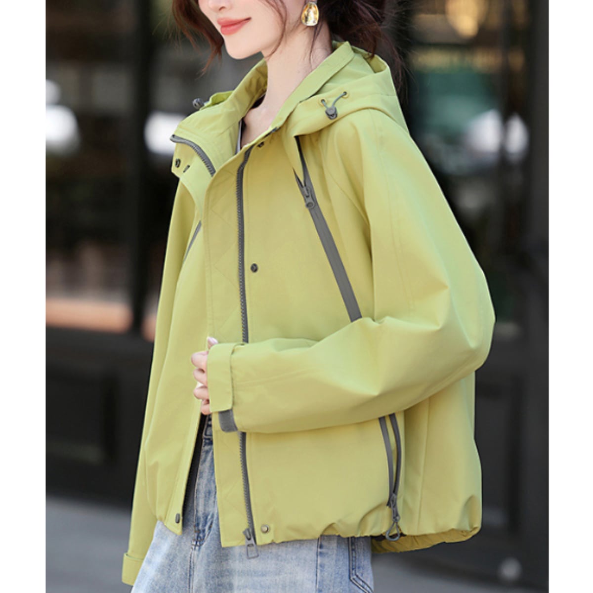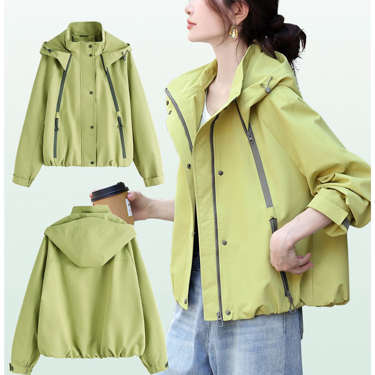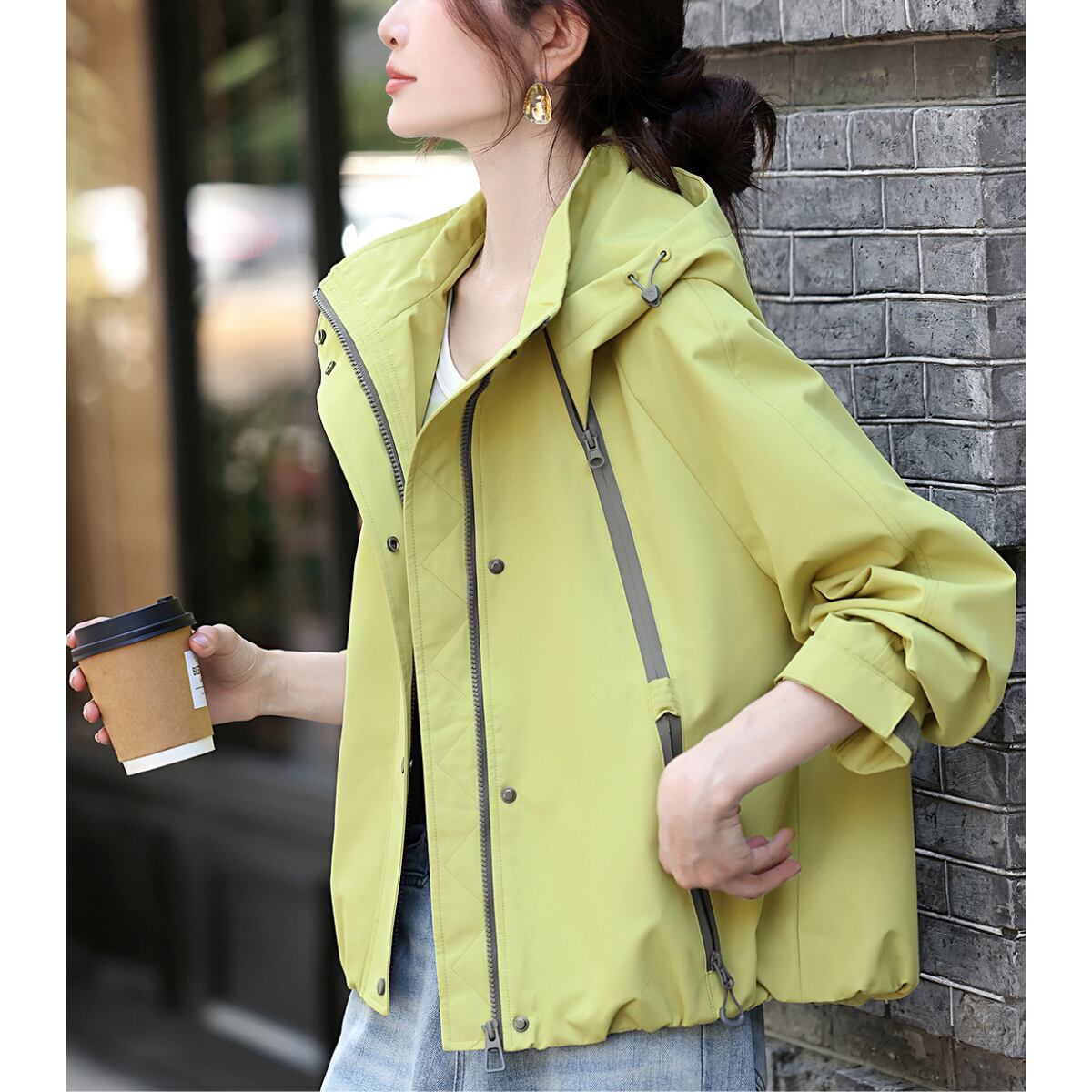 腰丈のコンパクトなシルエットで、スタイルアップ効果も期待できます。フード付きなので、急な小雨や肌寒い日にさっと羽織れるのが魅力です。
