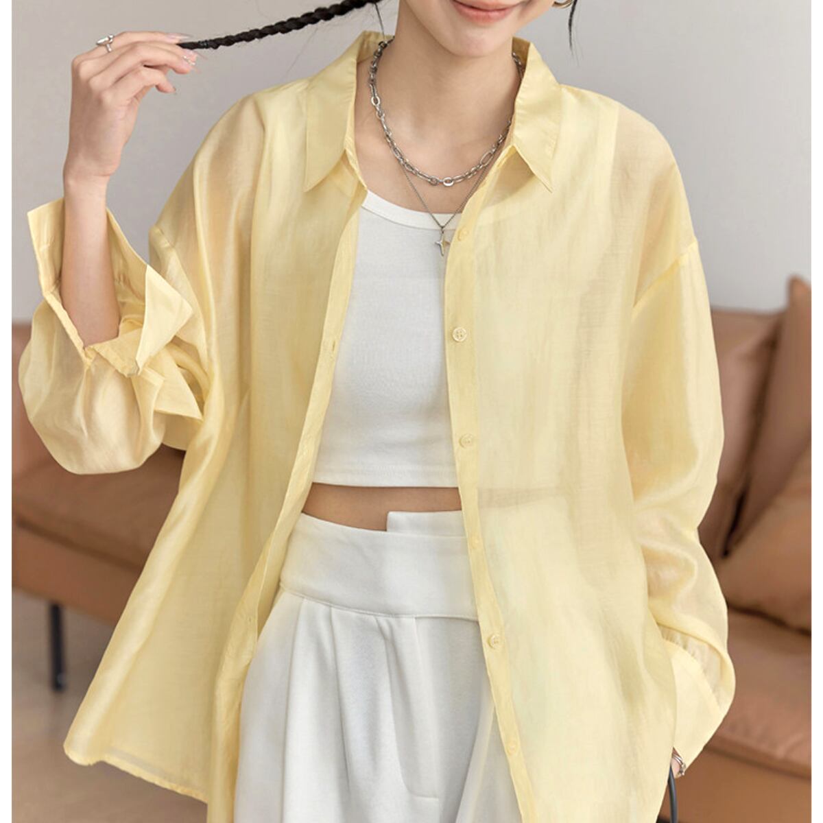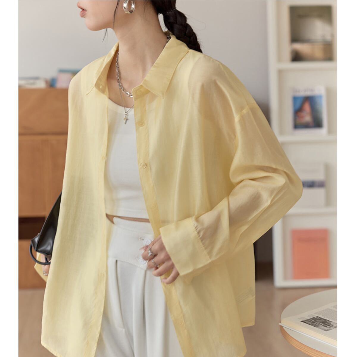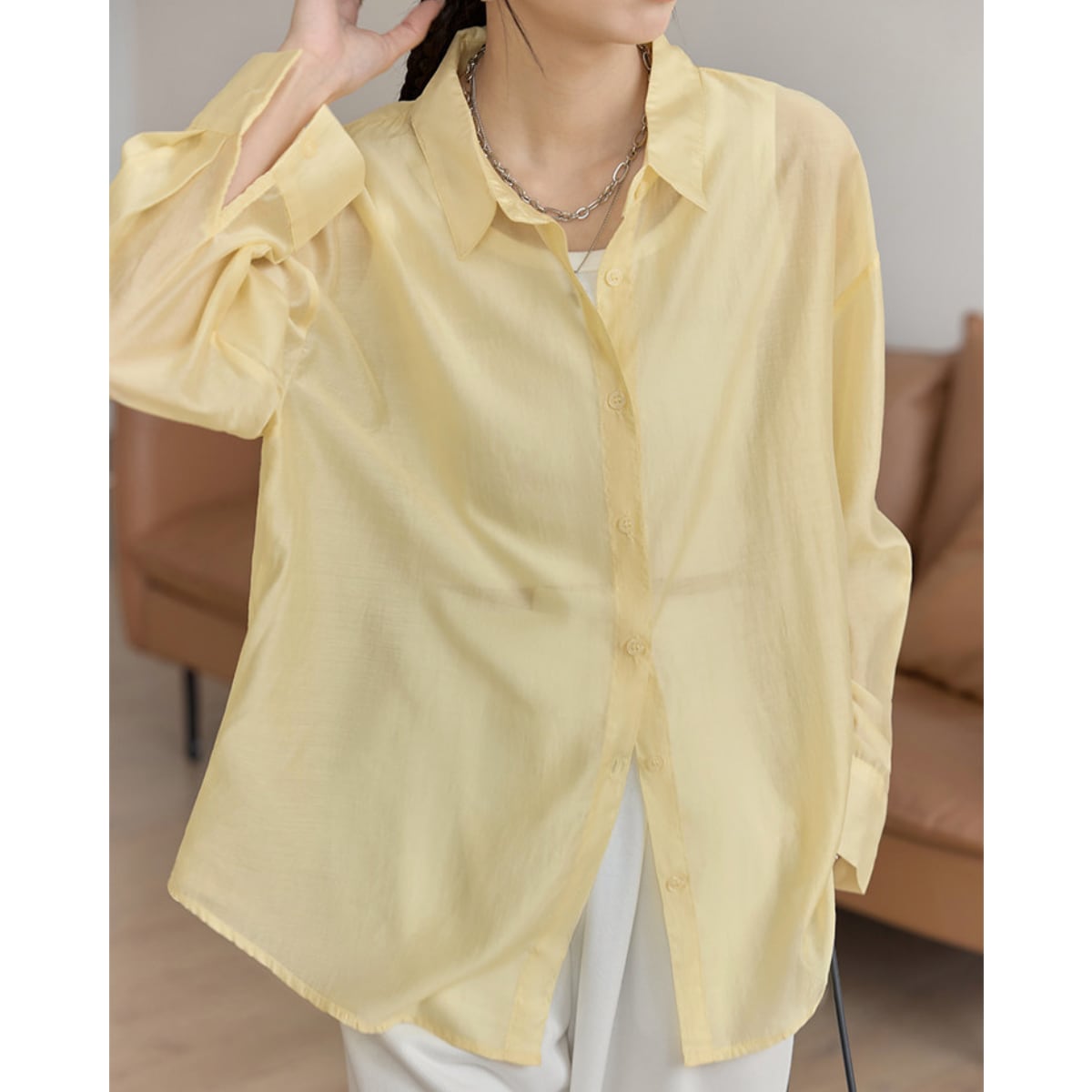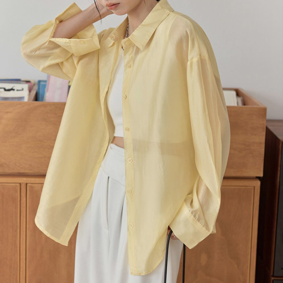 長袖 シアーシャツ ヒップ丈 イエロー ホワイト S8004