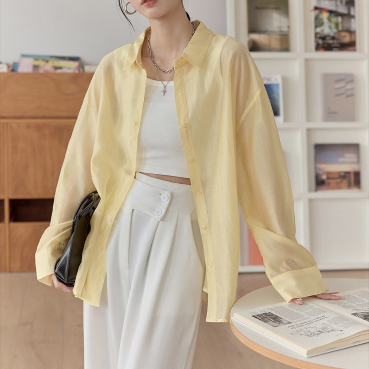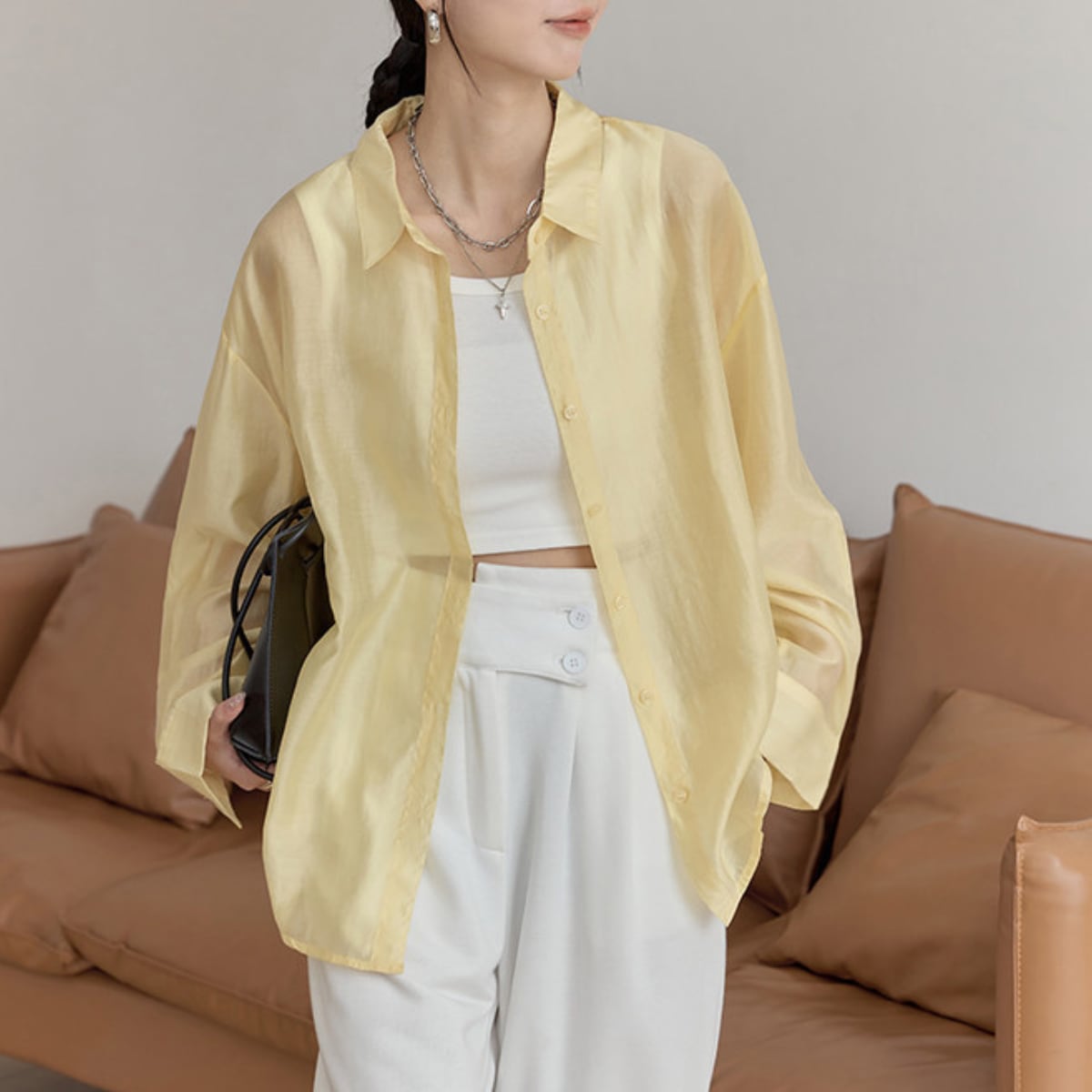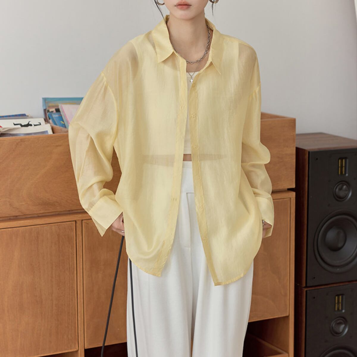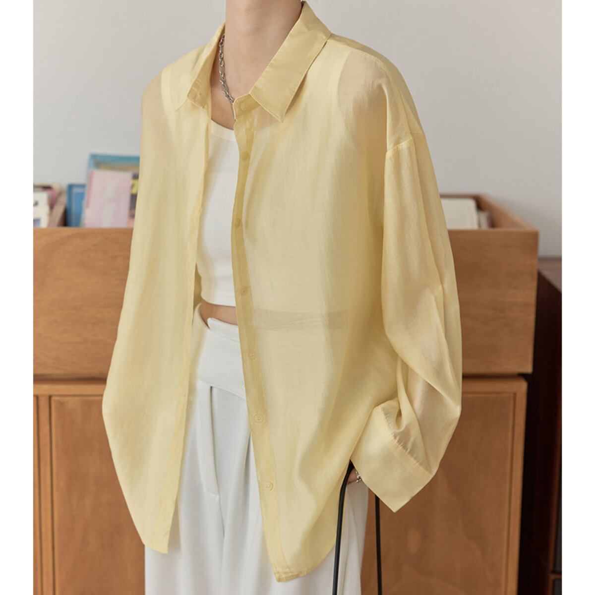 長袖 シアーシャツ ヒップ丈 イエロー ホワイト S8004