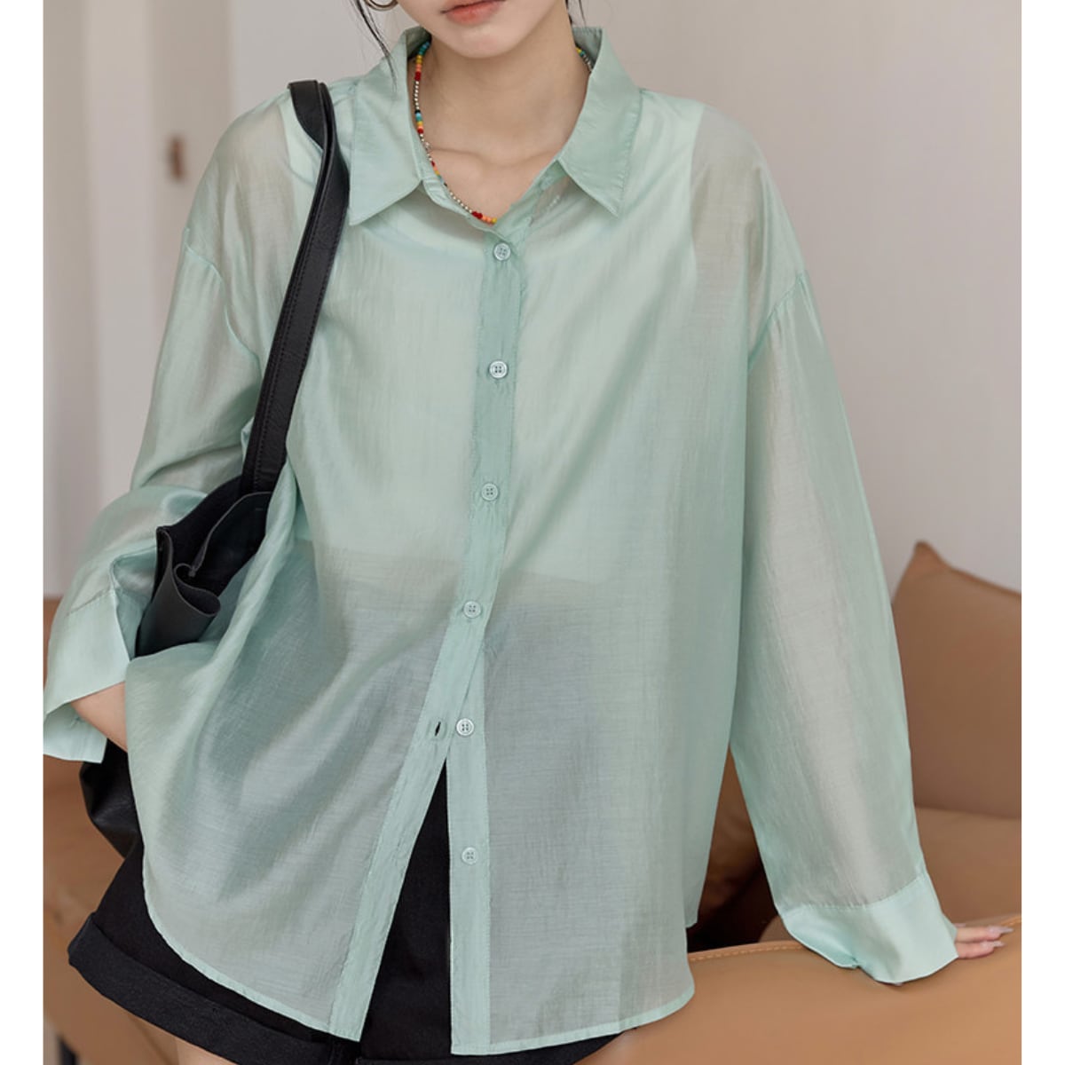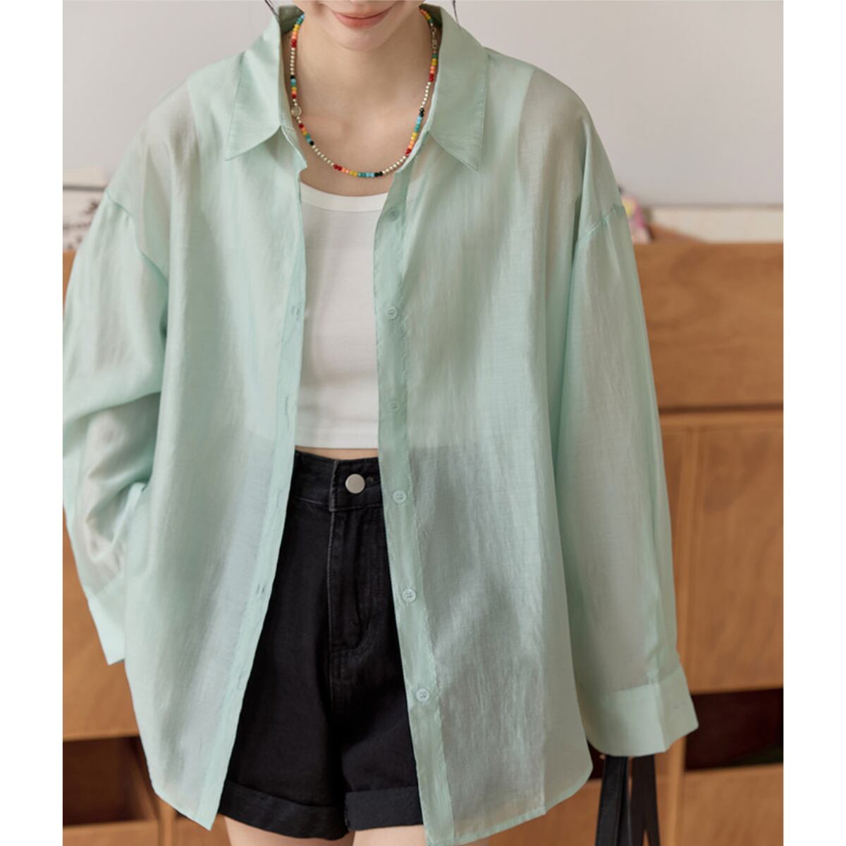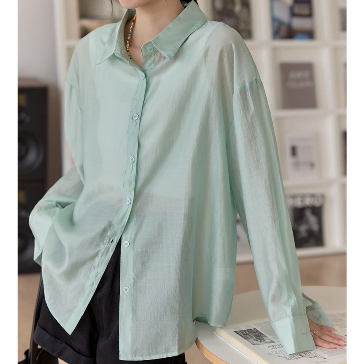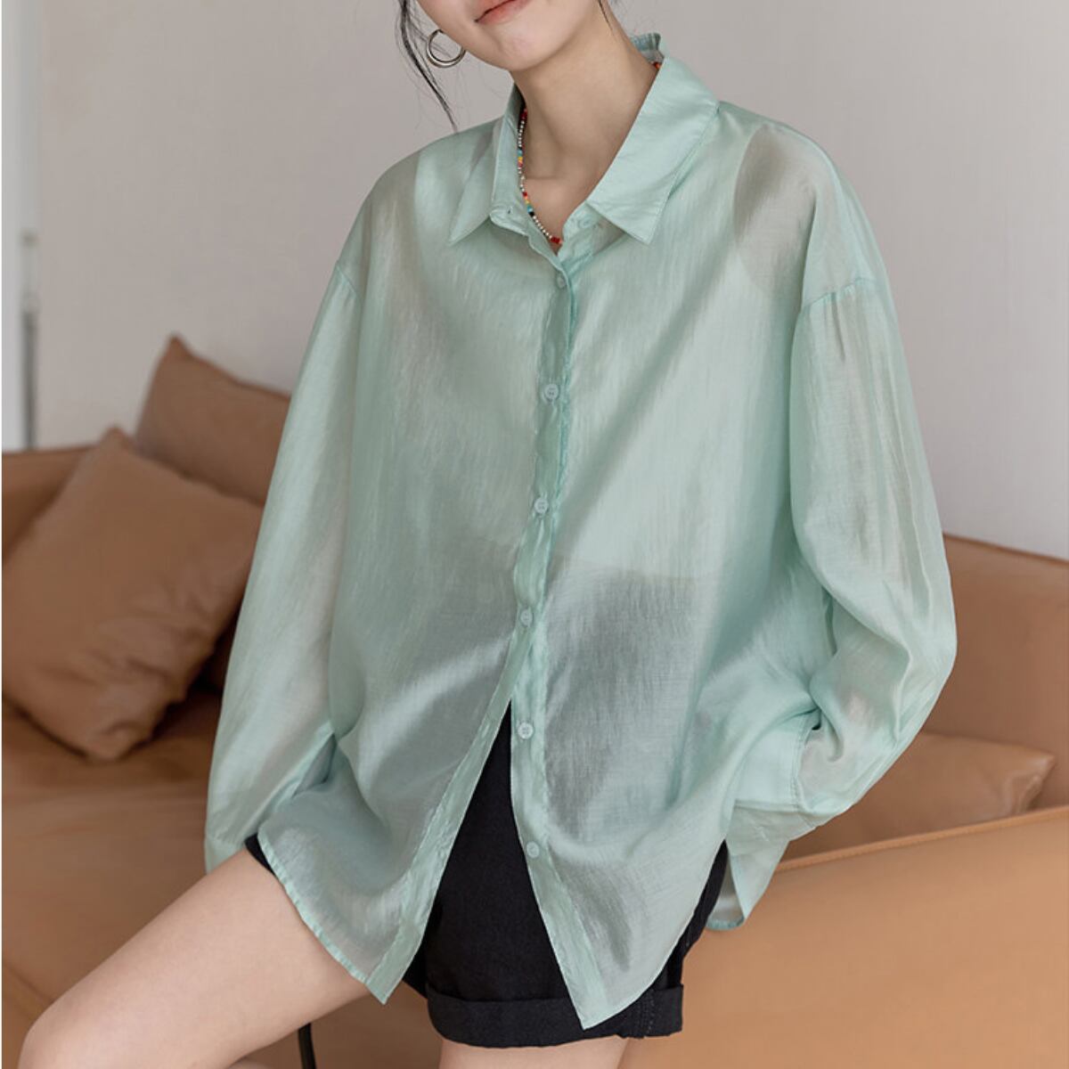 長袖 シアーシャツ ヒップ丈 グリーン ライトブルー S8005