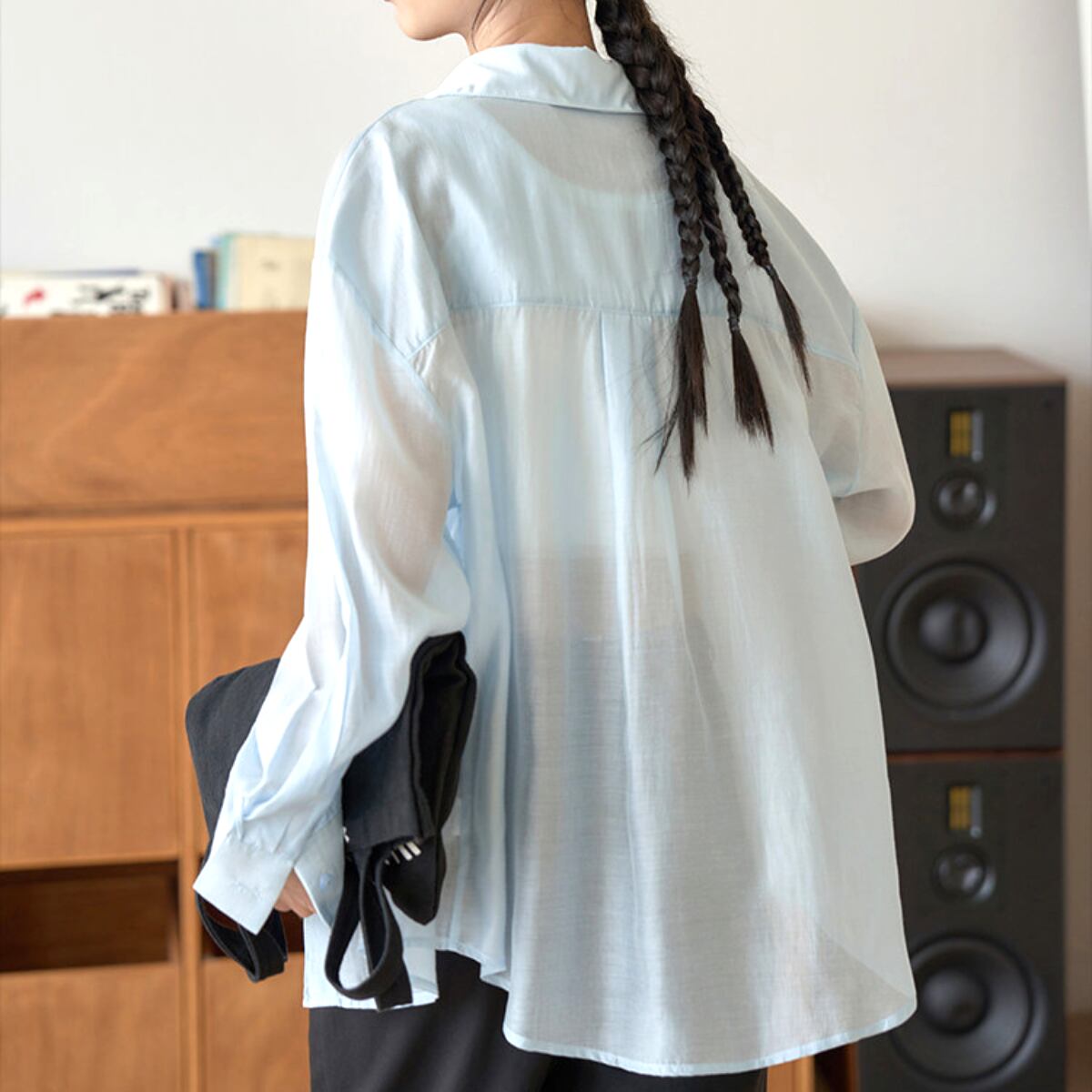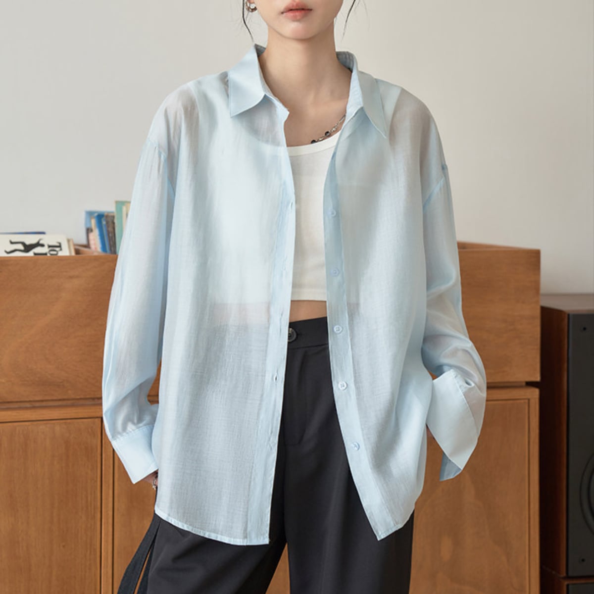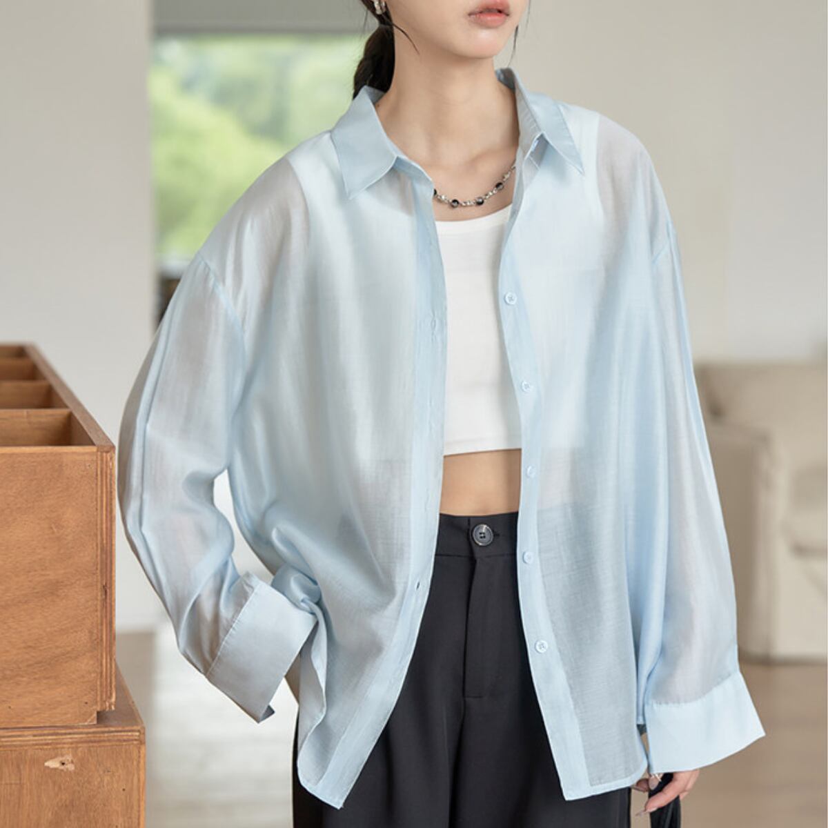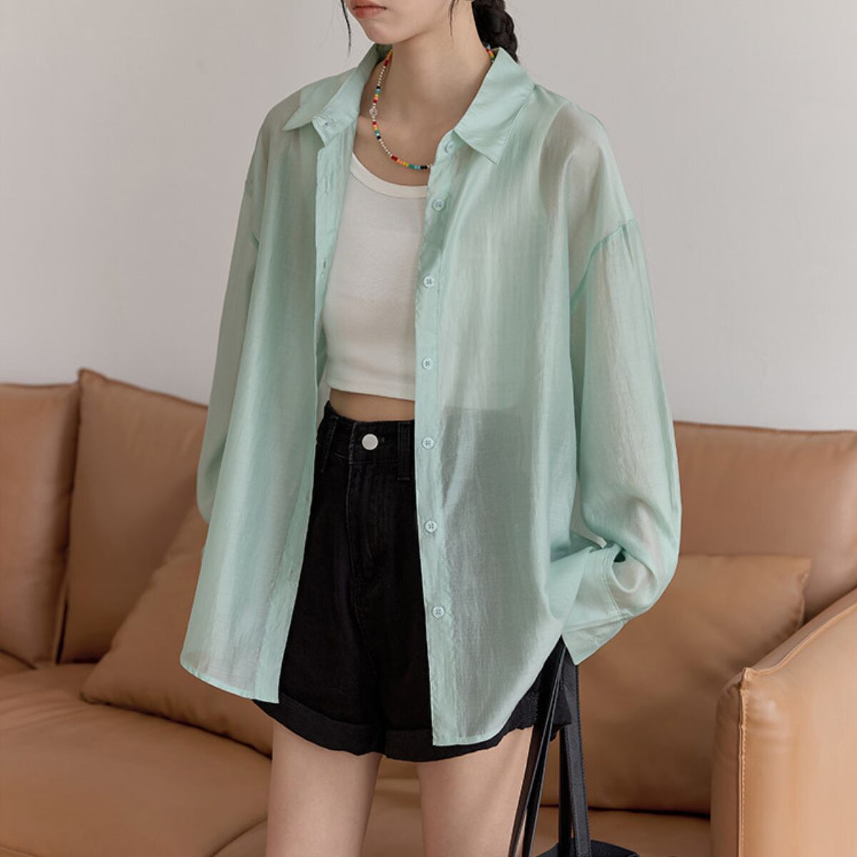 長袖 シアーシャツ ヒップ丈 グリーン ライトブルー S8005