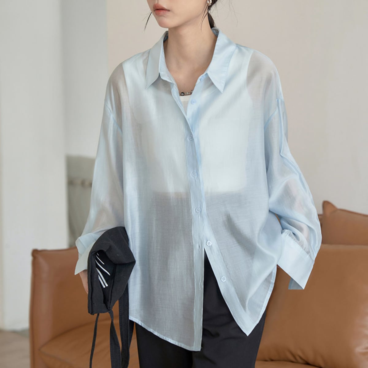 上品な透け感が魅力の、長袖カラーシャツ。
