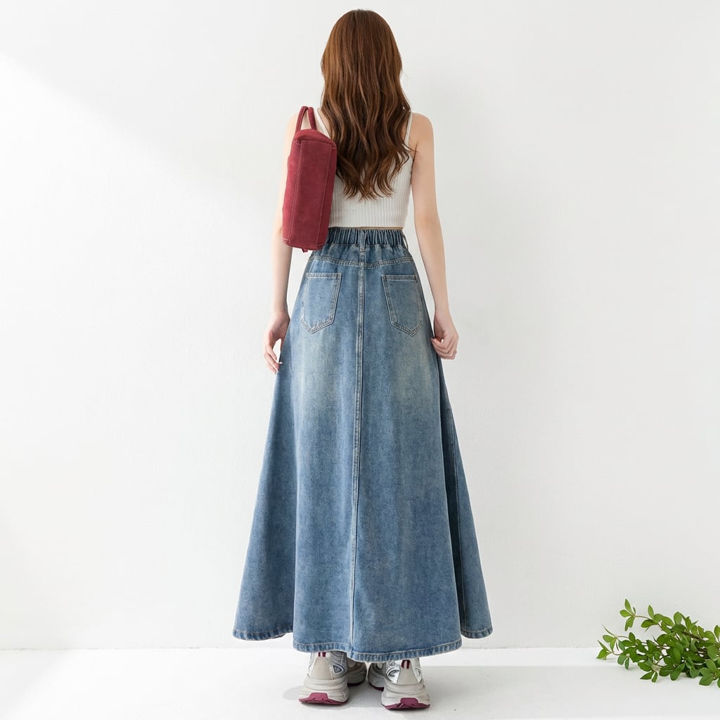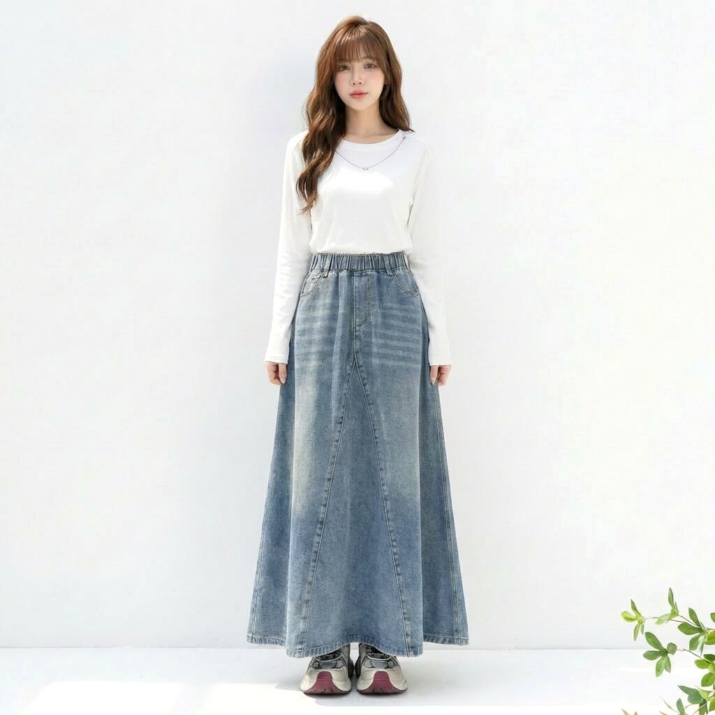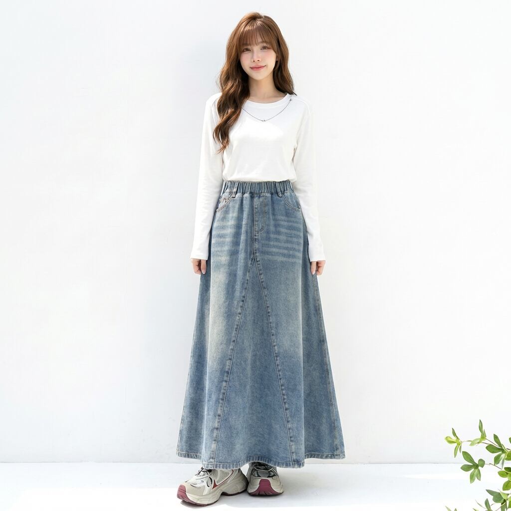 ウエストゴム フレア マキシ丈デニムスカート ブルー BS4003