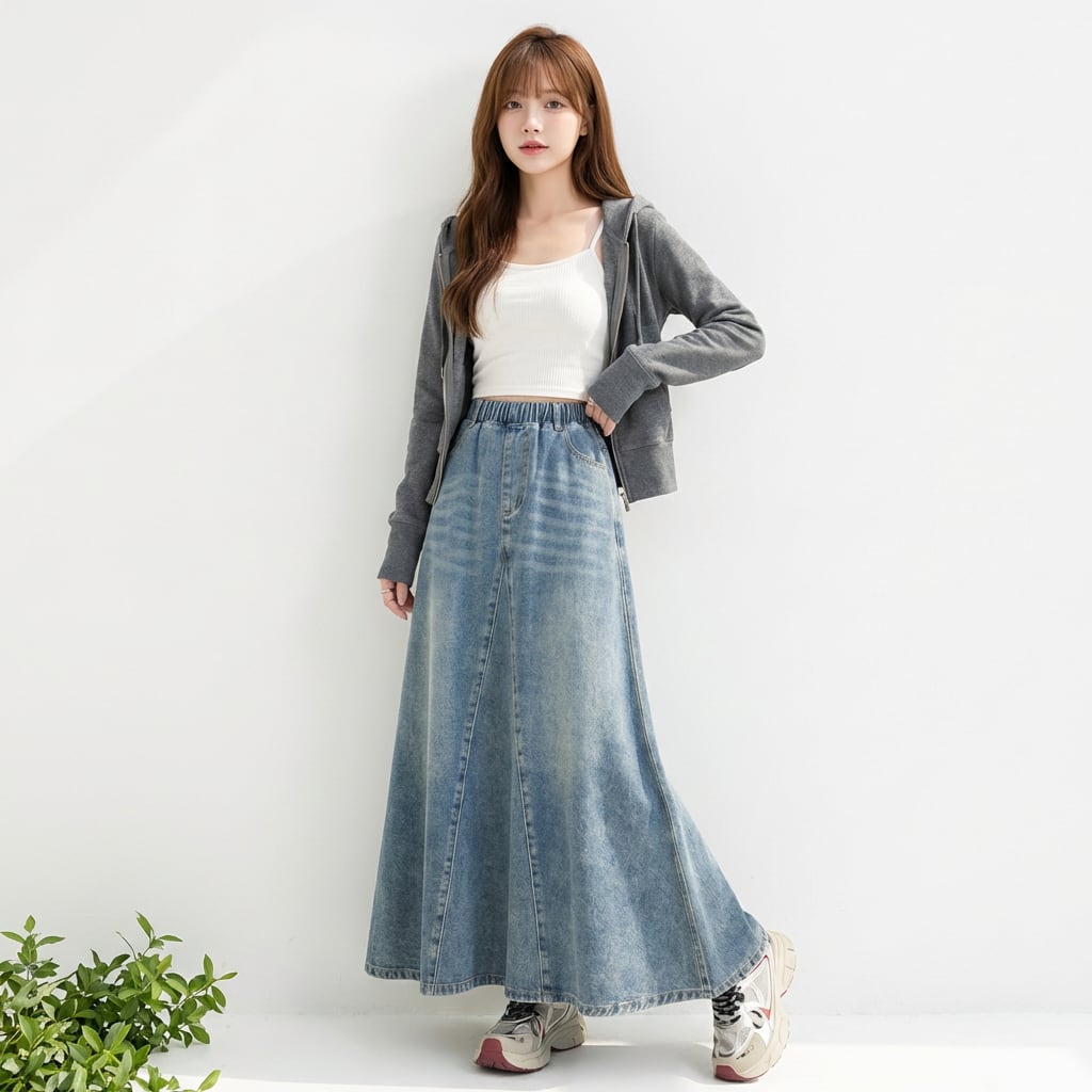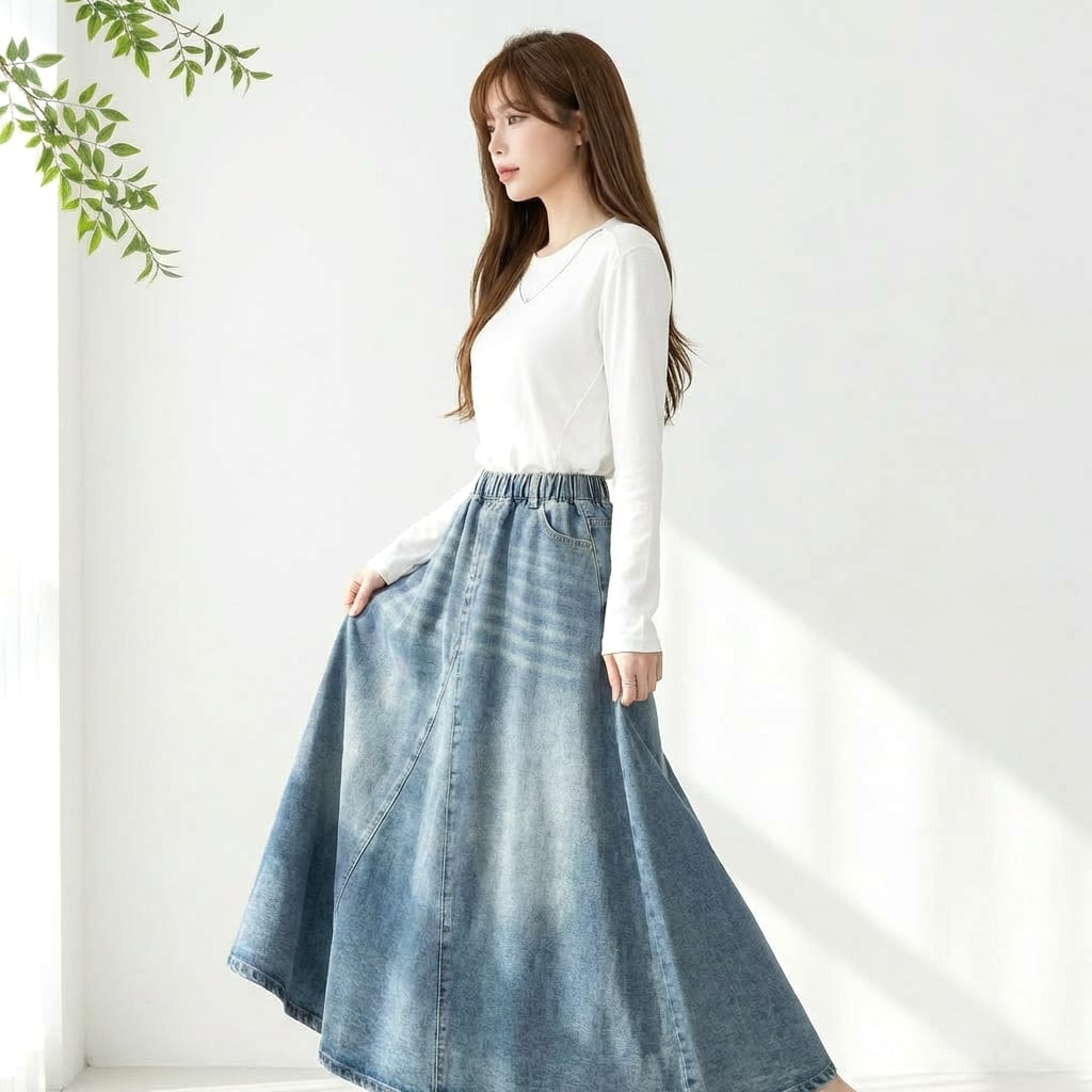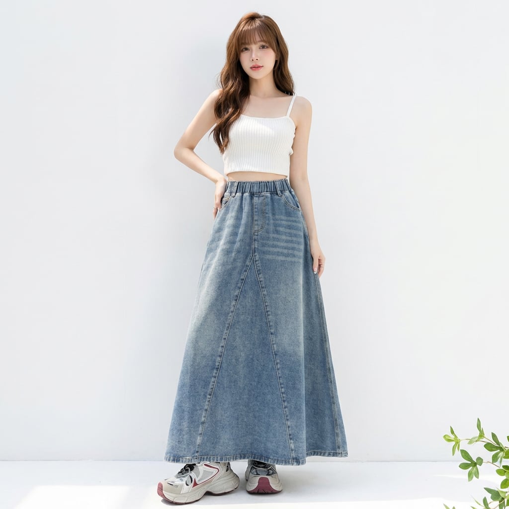 ウエストゴム フレア マキシ丈デニムスカート ブルー BS4003