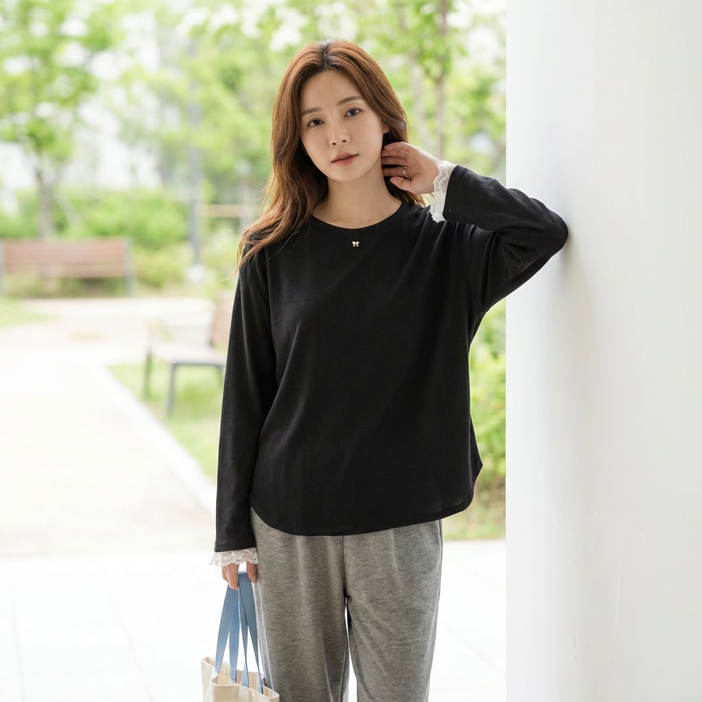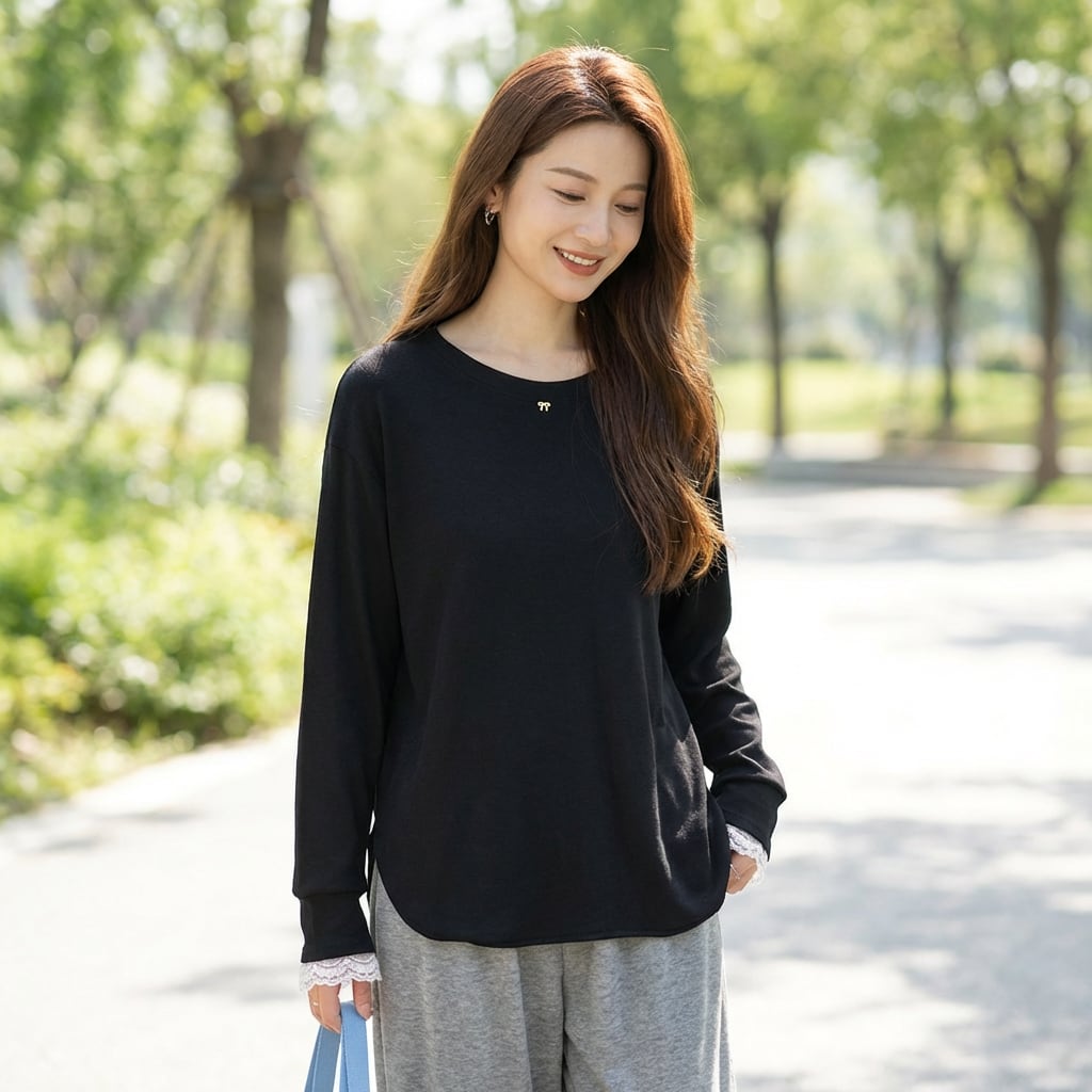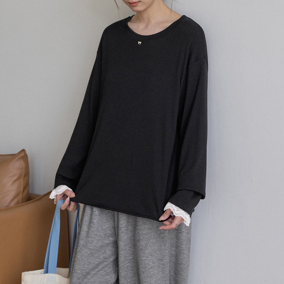 長袖 ヒップ丈 レース付き カットソー ブラック ホワイト K0008