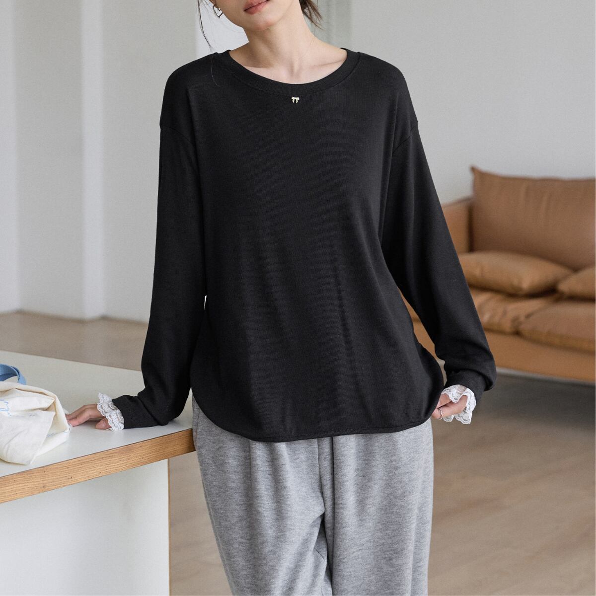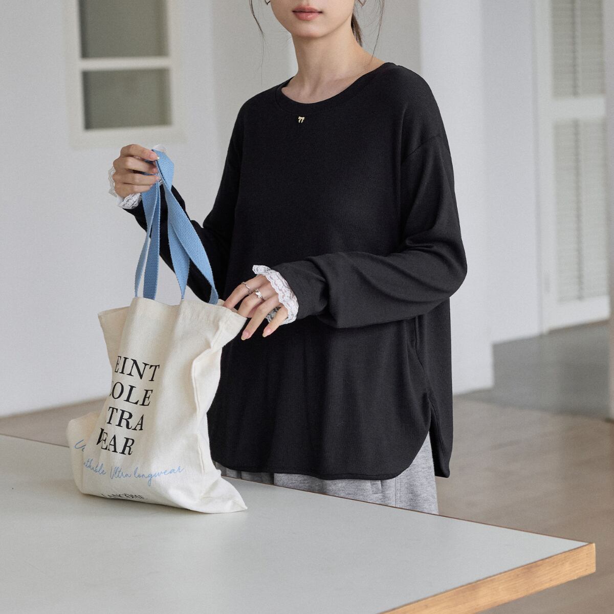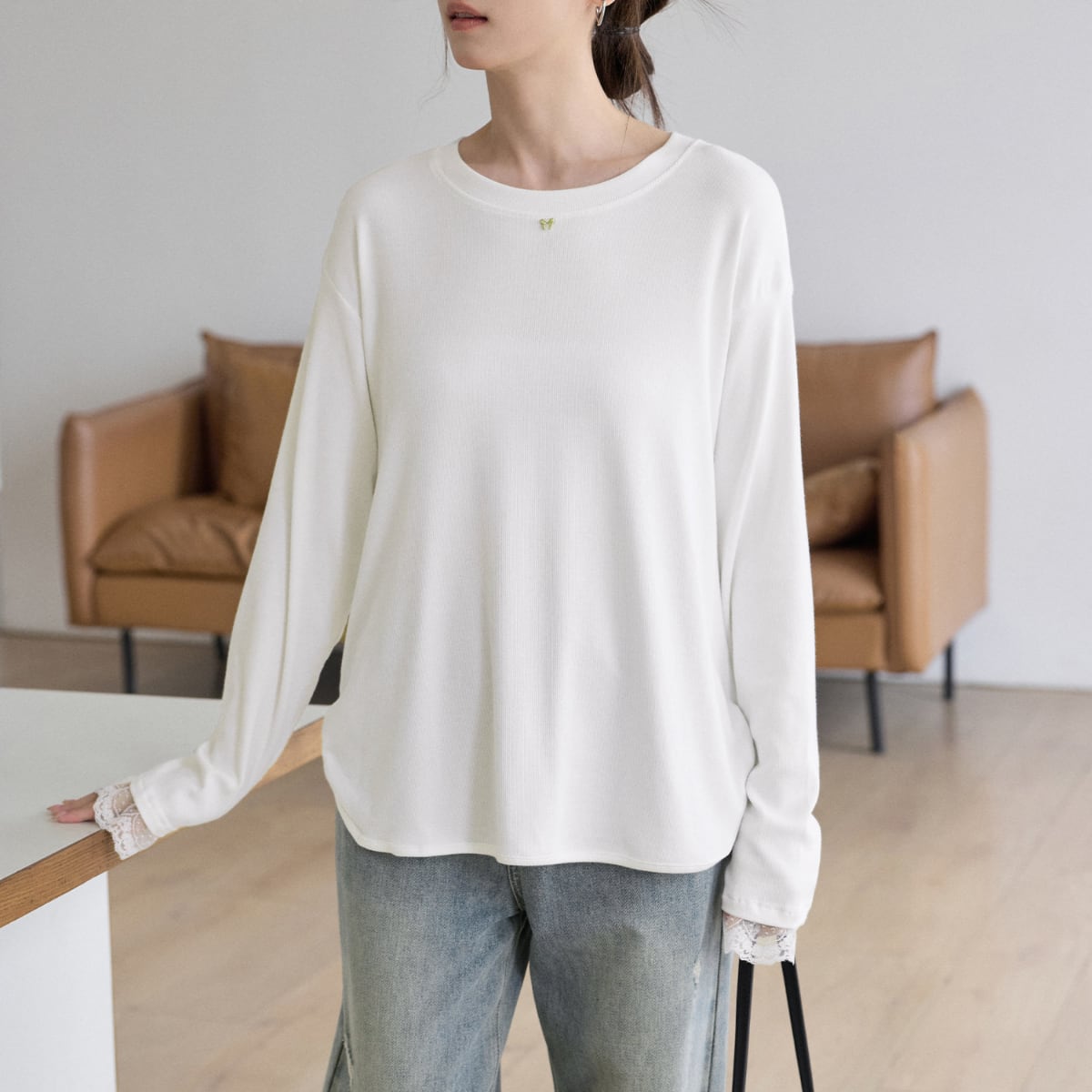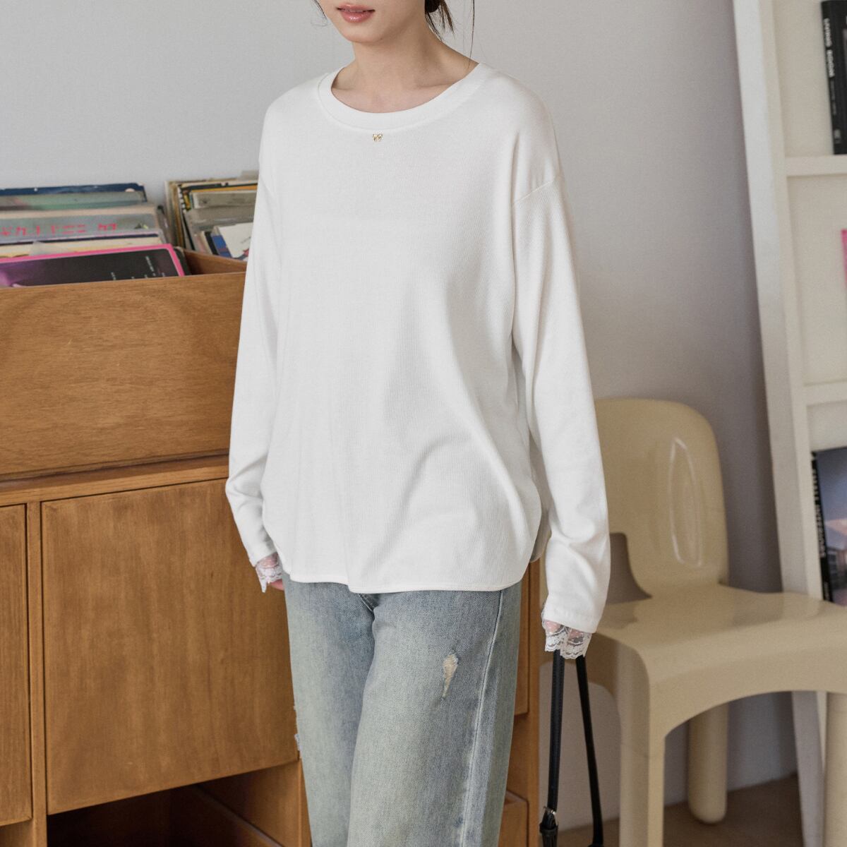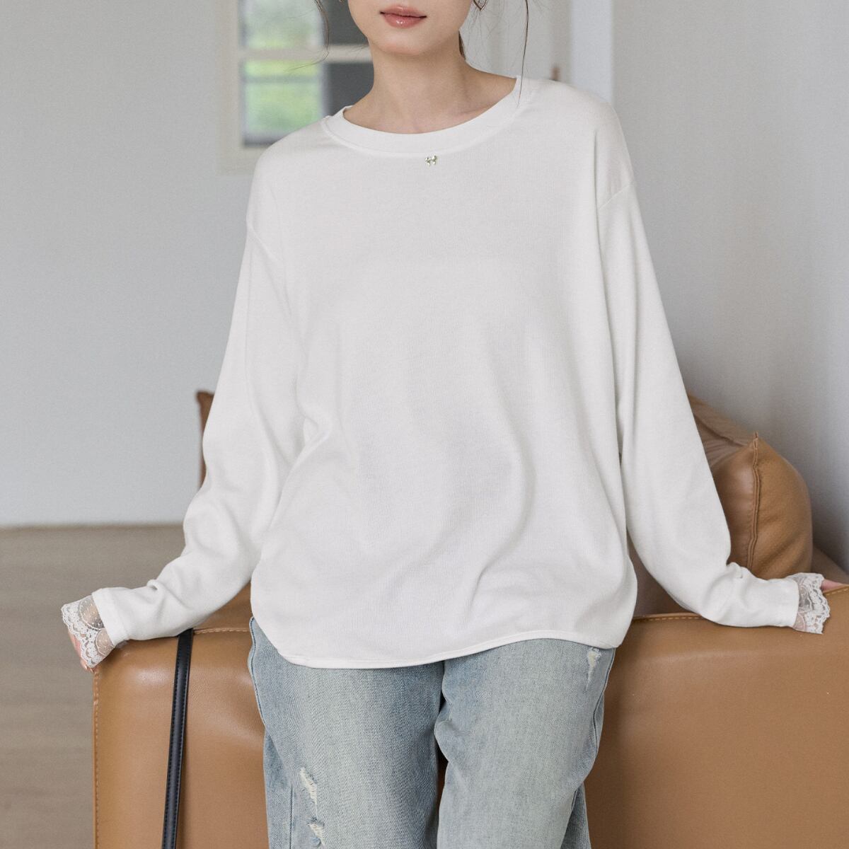 袖口から覗く繊細なレースが、カジュアルな着こなしにを女性らしさをプラスします。