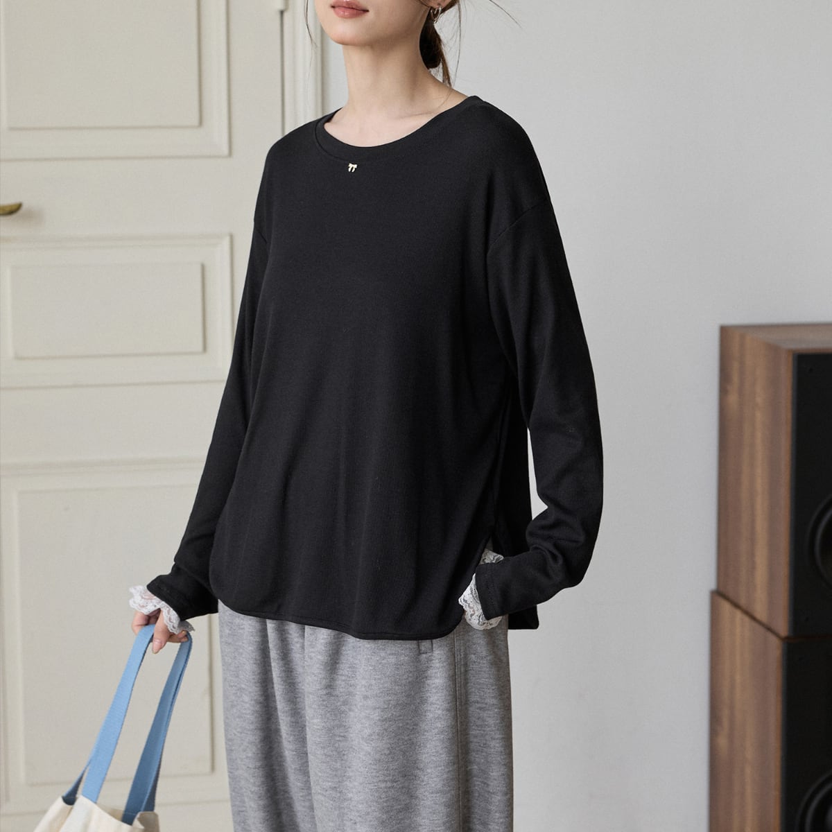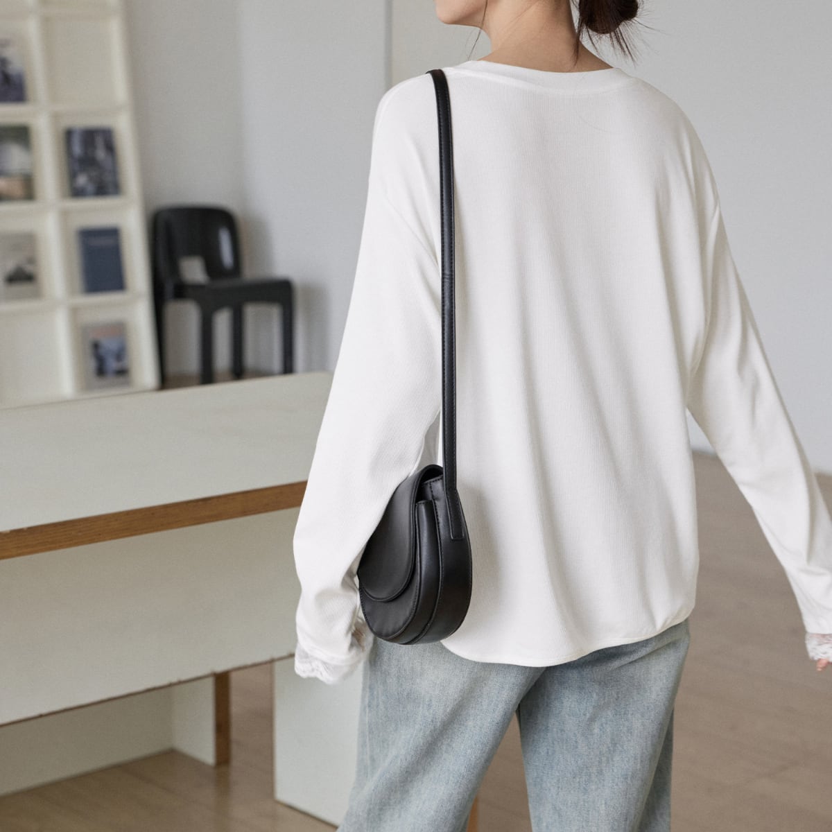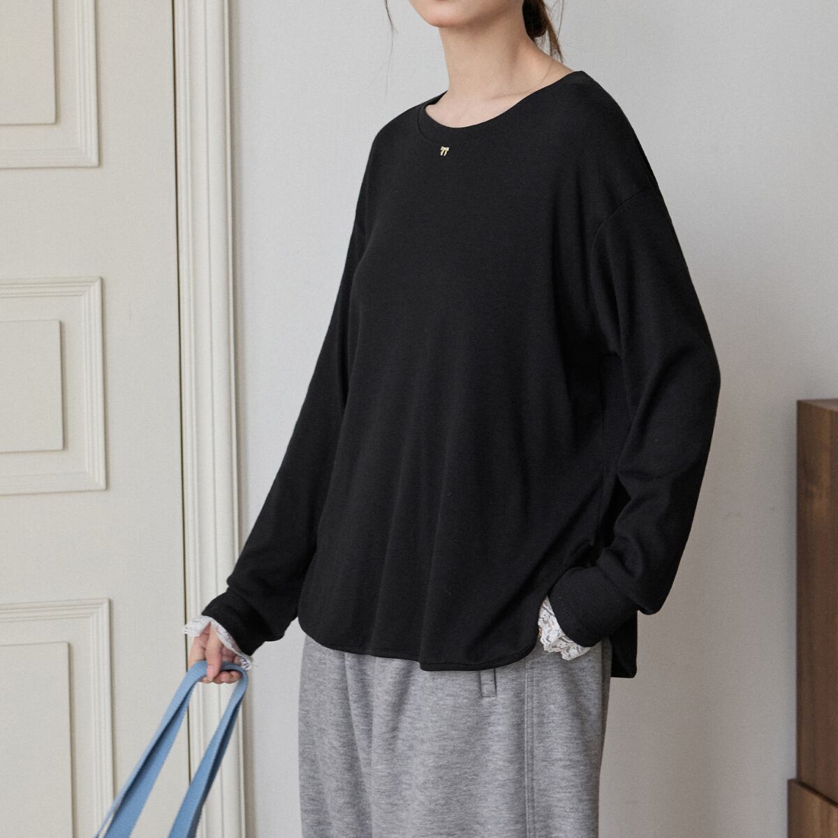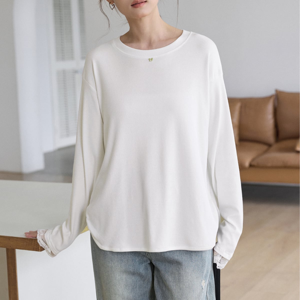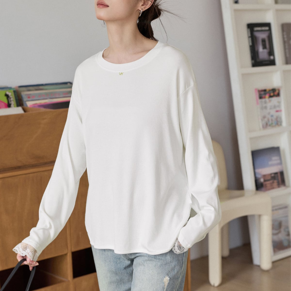 袖口から覗く繊細なレースが、カジュアルな着こなしにを女性らしさをプラスします。