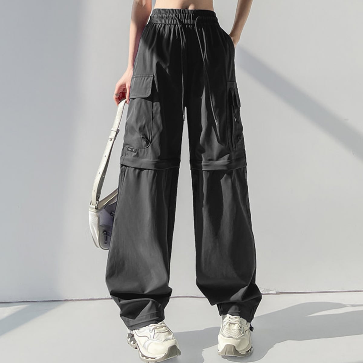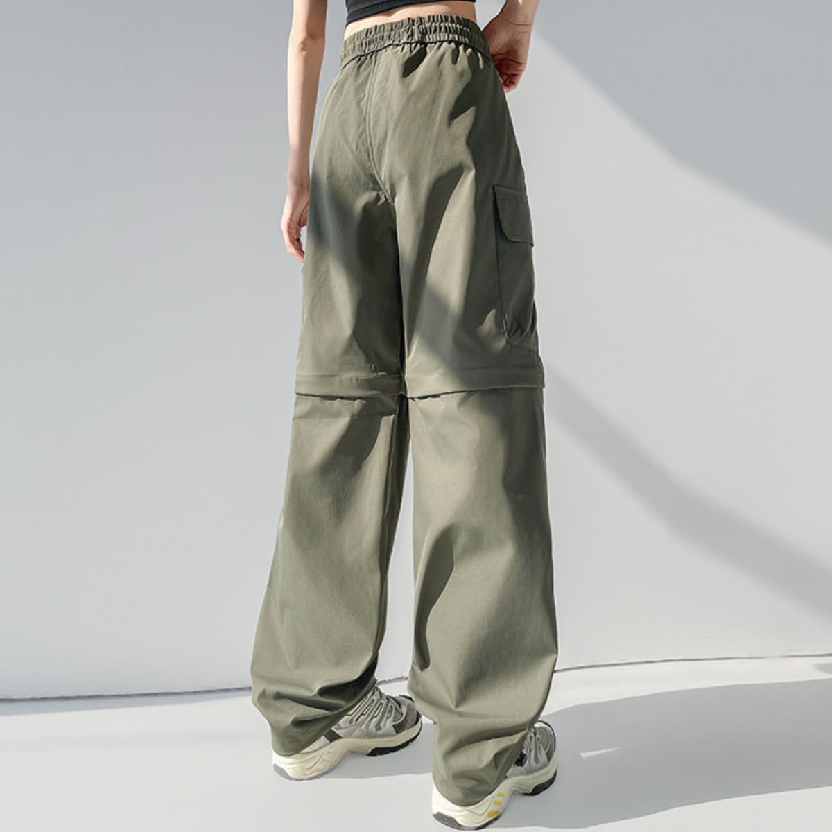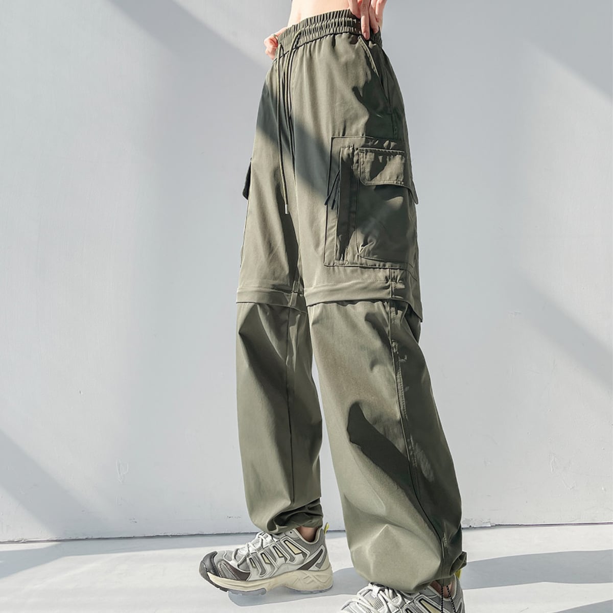 膝部分のファスナーで取り外し可能で、ロングパンツとショーツの2通りのスタイルが楽しめるカーゴパンツ。