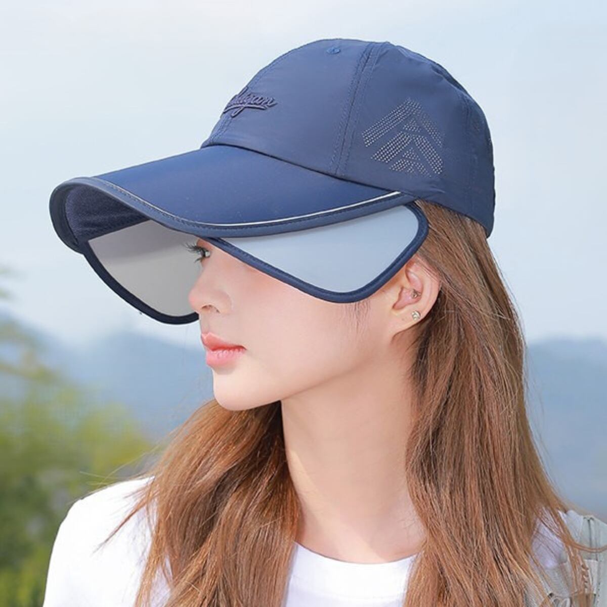 強い日差しの時はバイザー部分を広げて、顔まわりをしっかりガード。