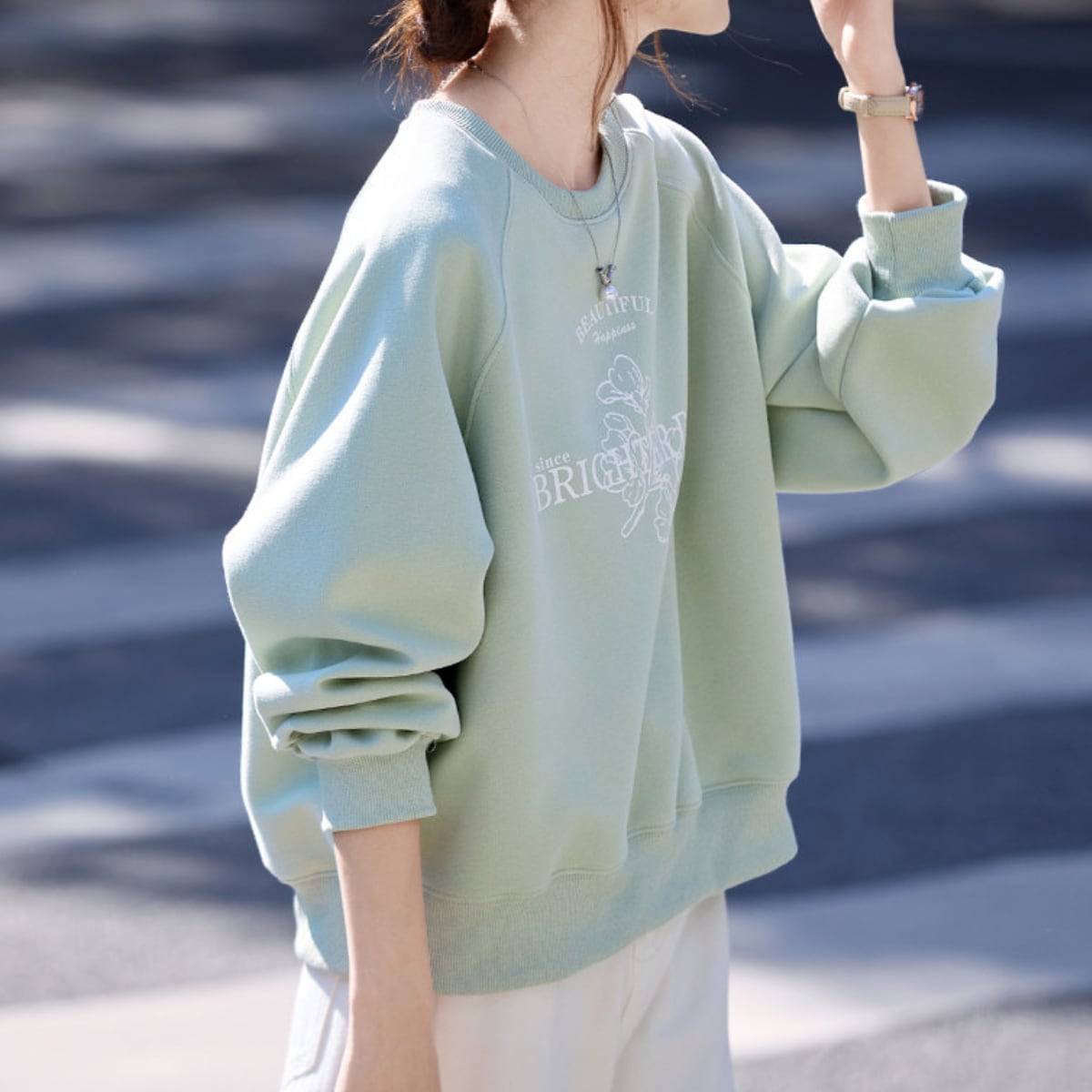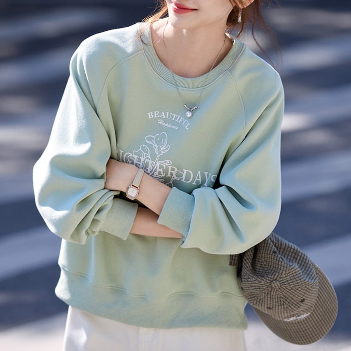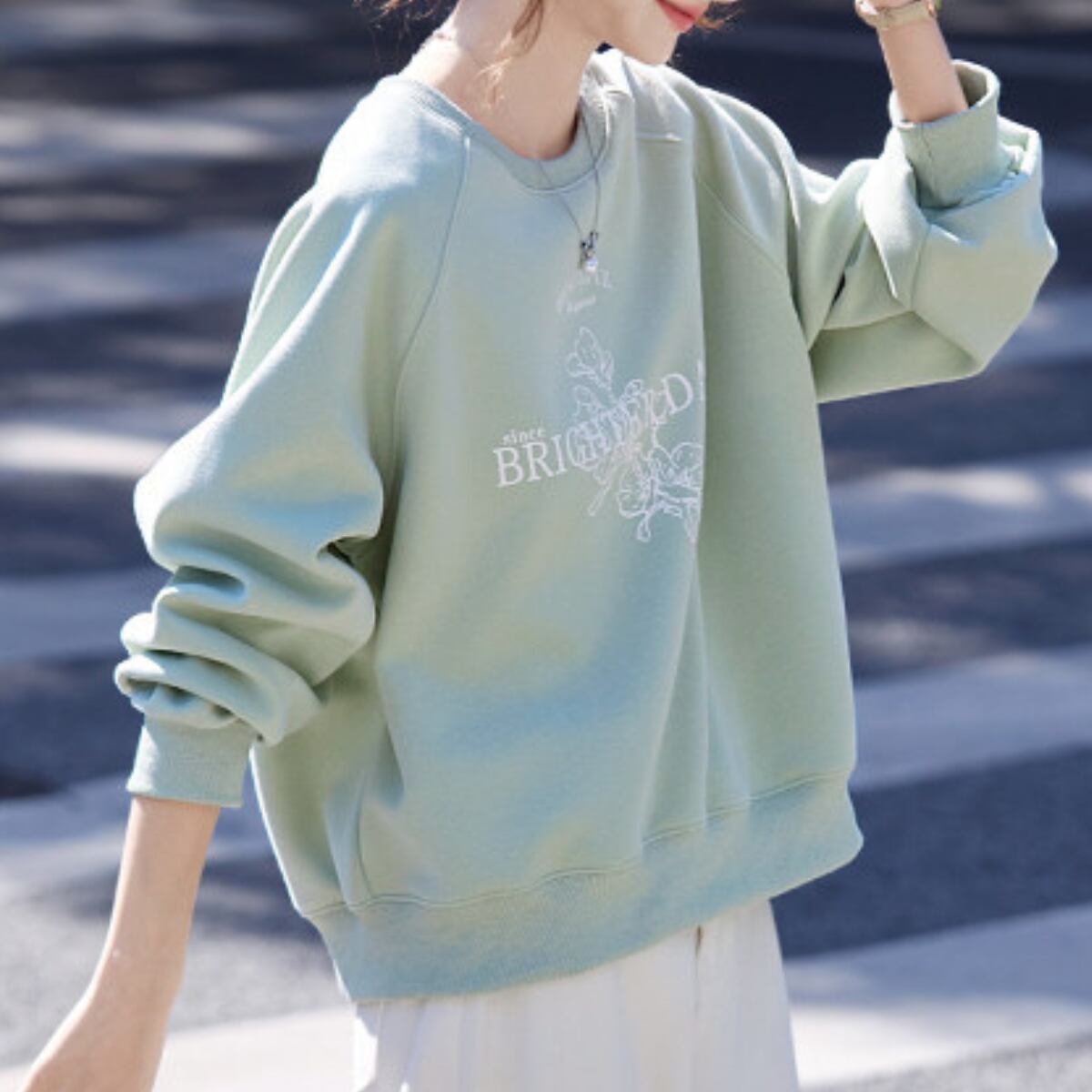 カジュアルだけど上品。プリント入りスウェットで、大人の余裕を演出。