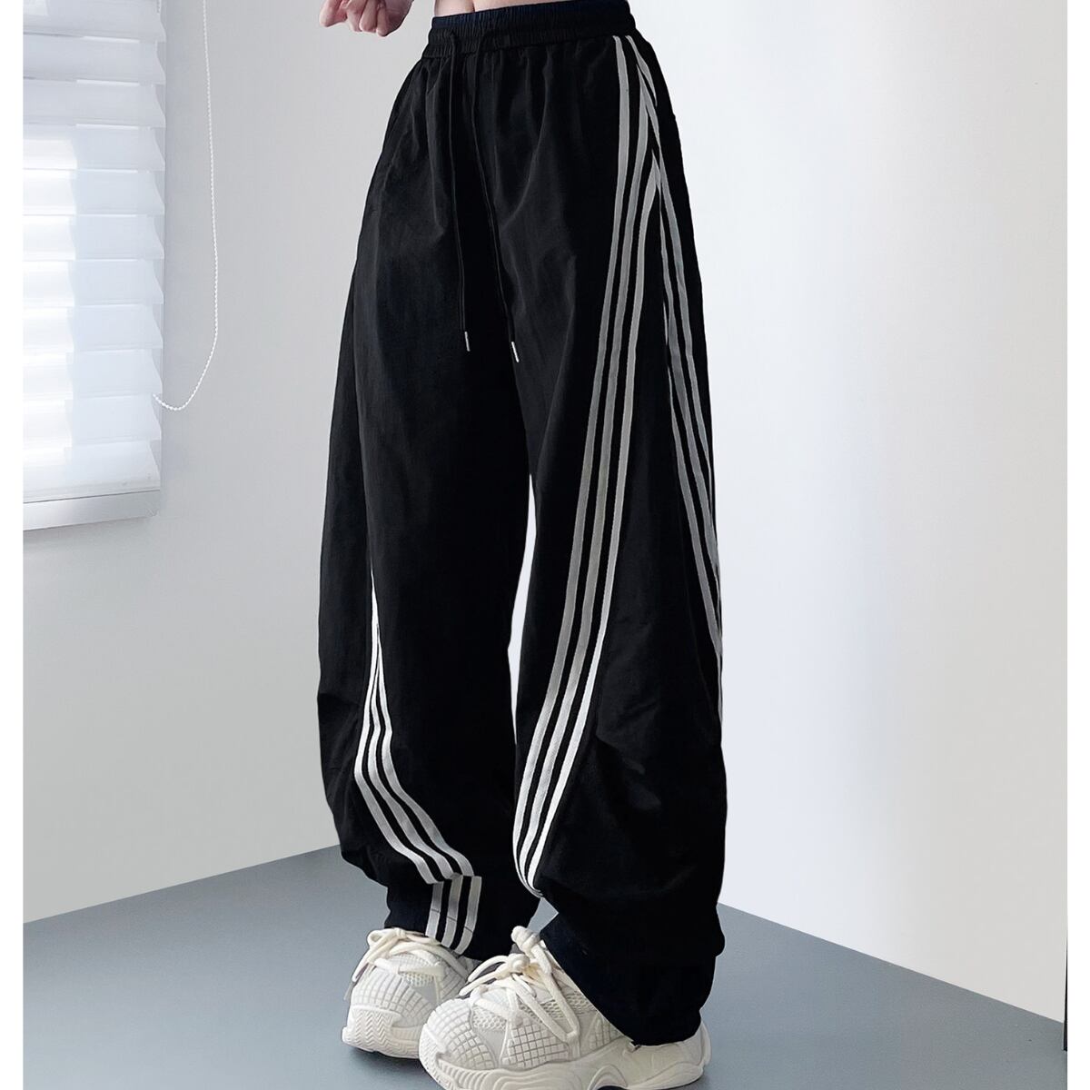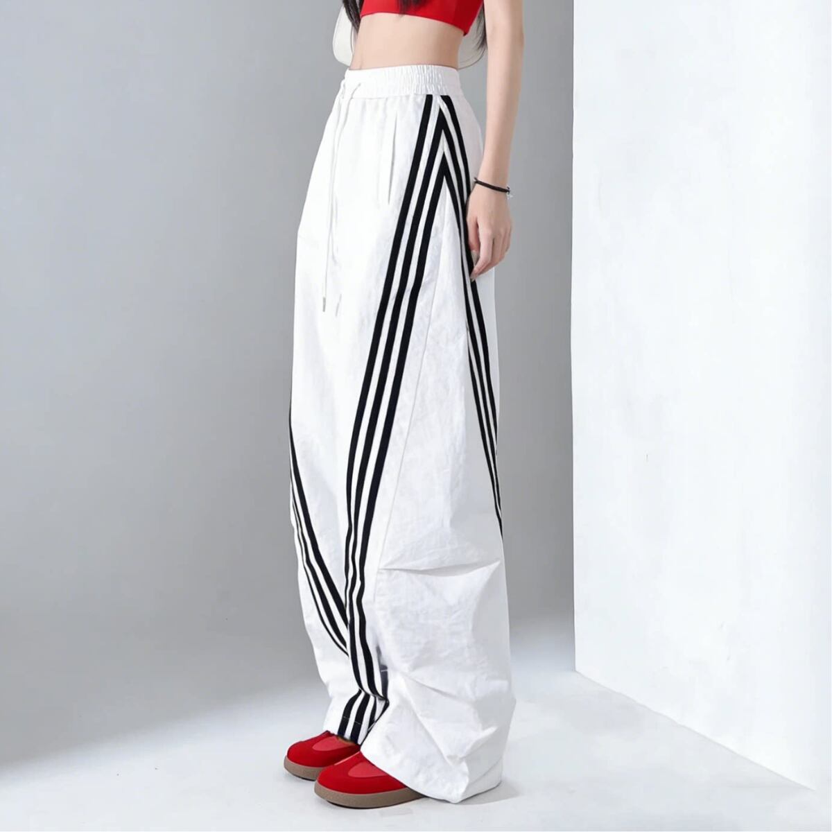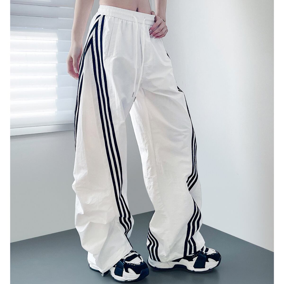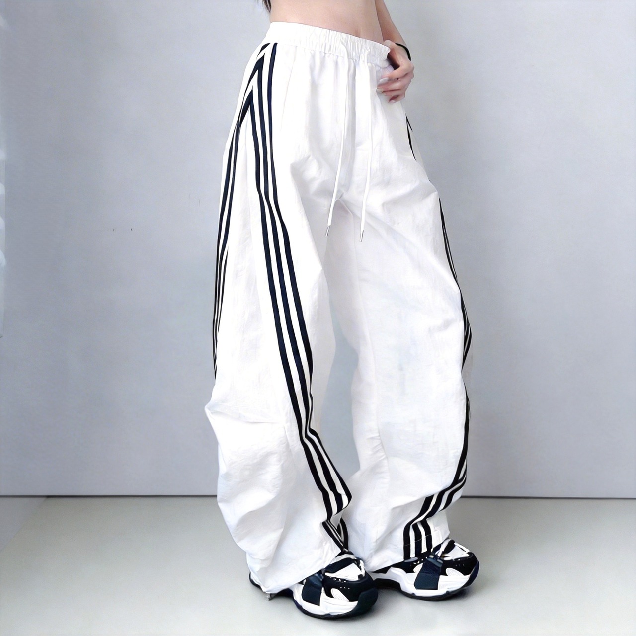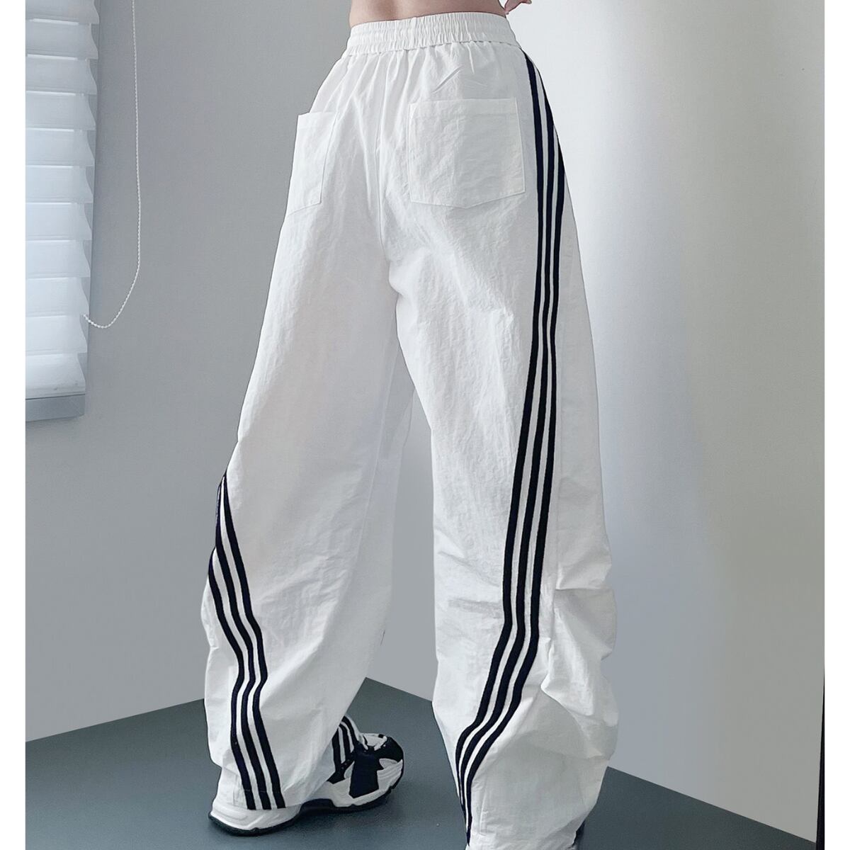 大胆なワイドシルエットとサイドラインが目を惹く、トレンド感あふれるパンツ。