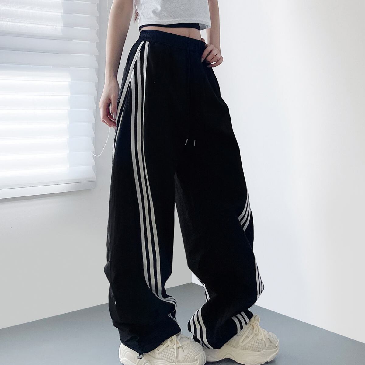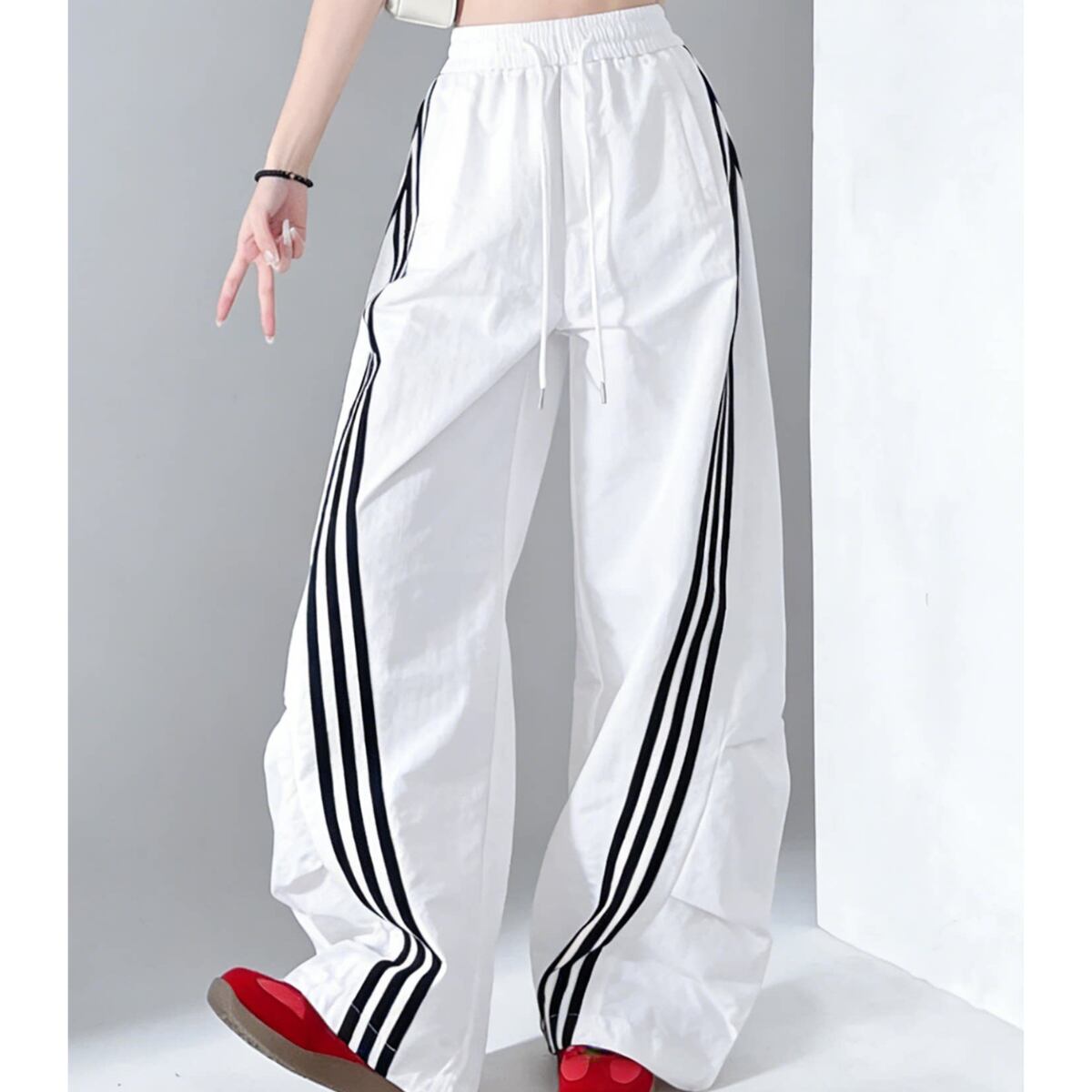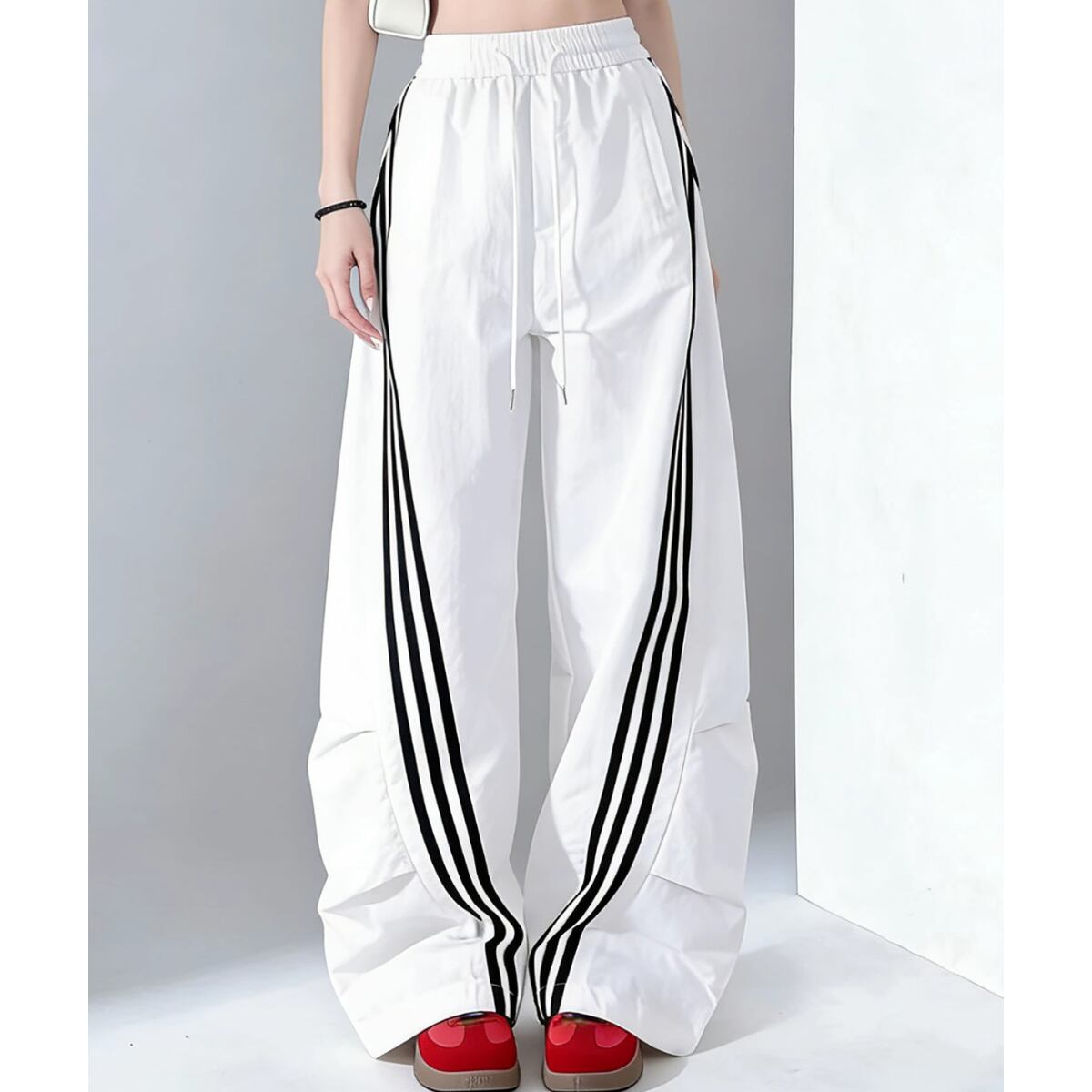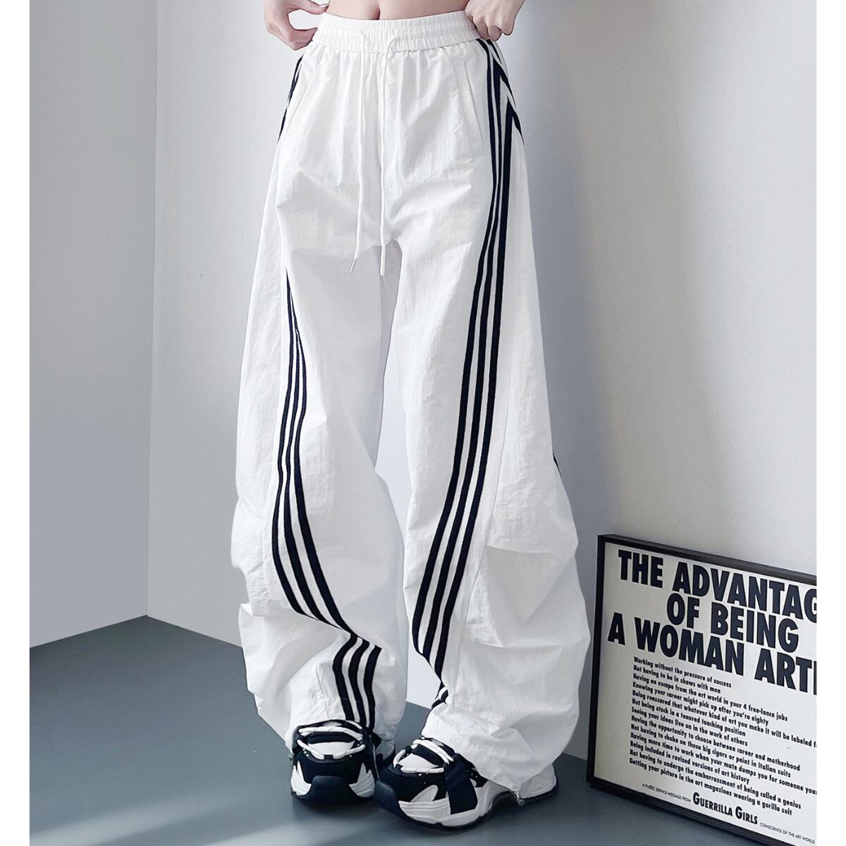 大胆なワイドシルエットとサイドラインが目を惹く、トレンド感あふれるパンツ。
