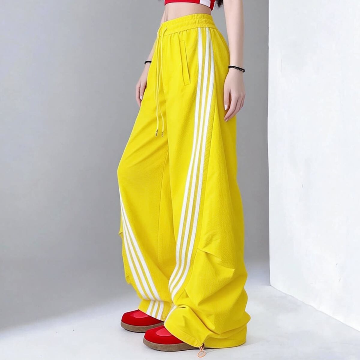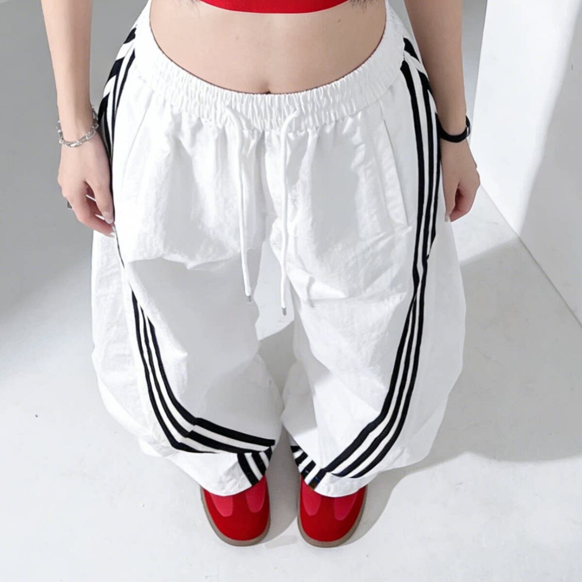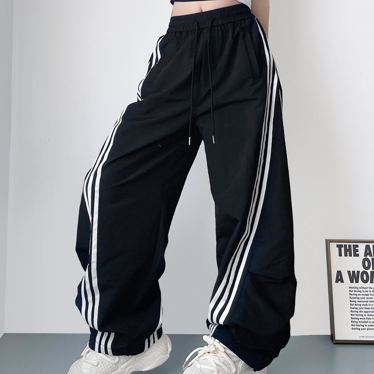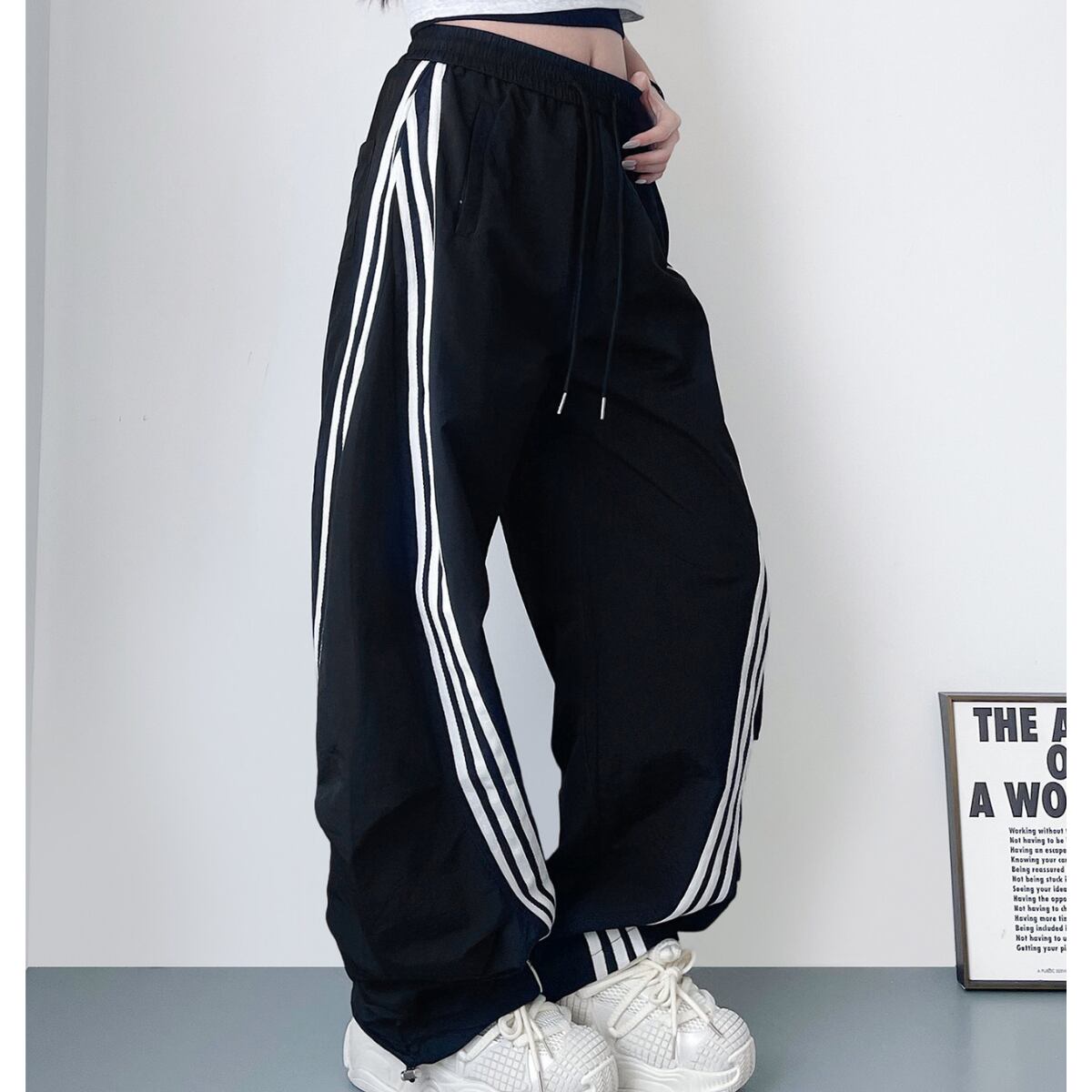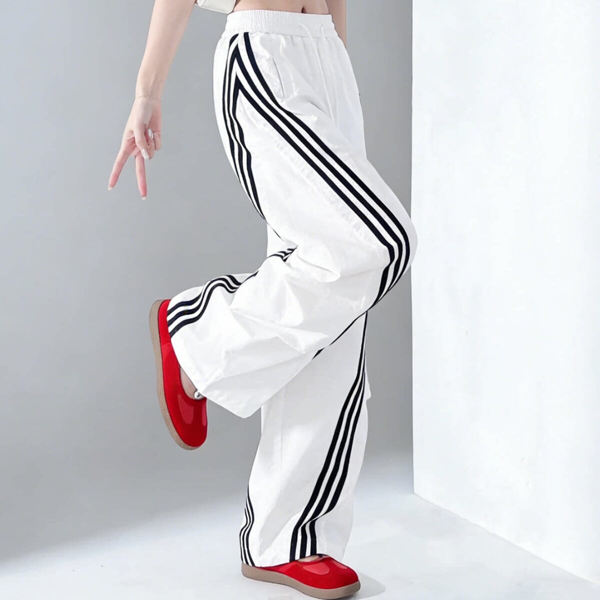 大胆なワイドシルエットとサイドラインが目を惹く、トレンド感あふれるパンツ。
