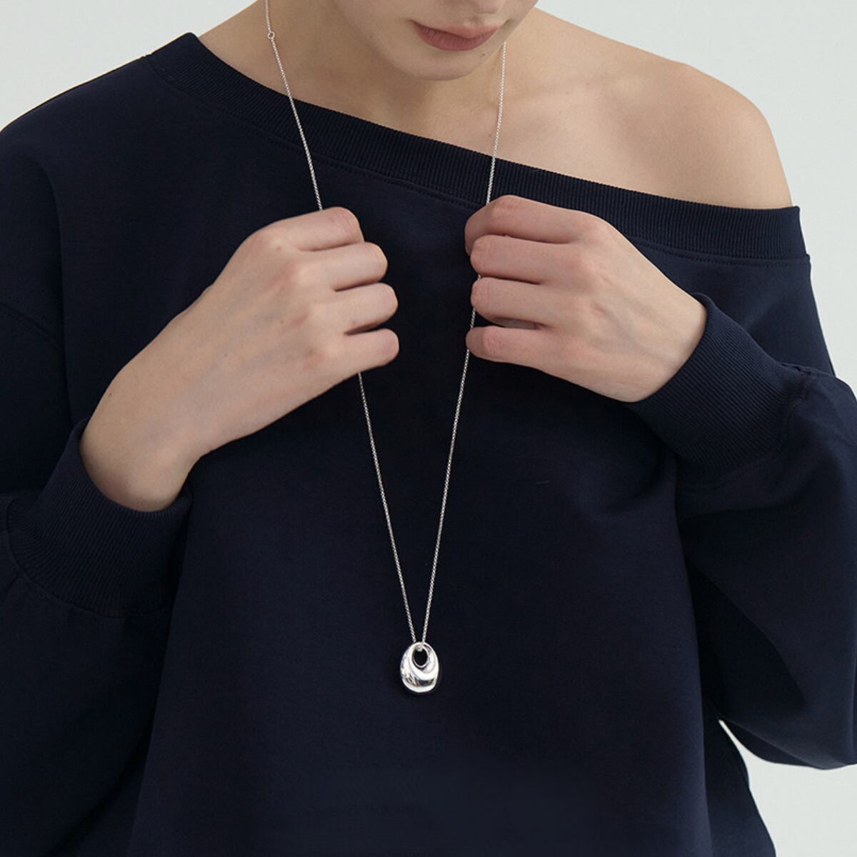 ロングタイプのチェーンが縦ラインを強調し、スタイルをすっきり見せてくれます。