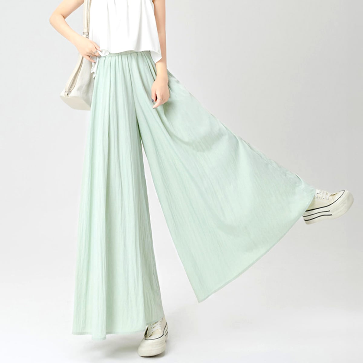 ウエストゴム ワイドレッグ フルレングスパンツ ライトグリーン アプリコット ネイビーブルー ブラック S3016